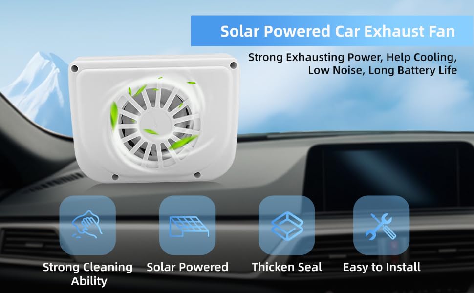Feature:【Solar Power】 External panel ensures fast charging, ideal for emergencies without a power source. Keeps your car cool and powered up.【Eco-Friendly】 Silently refreshes your vehicle, removing heat and odors, and replacing them with cool, fresh air using solar energy.【Dual Control】Offers flexibility with a dual solar and battery switch, allowing either source to operate independently for convenience.【Easy Installation】 Installs in seconds on any car window, ensuring secure charging even in rainy weather without complex tools.【Efficient Cooling】 Designed to fit atop car windows, this solar fan vents hot air out, cooling the interior efficiently in hot weather.Specification:Power: 10wColour: WhiteNet Weight: 411gSolar Panel Voltage: 3.5v/300maSolar Panel Size: 110 * 60mmDuration: 20hCharging Time In The Sun: 2hShell Material: ABSFan Mode: I Is For Solar Control,Ii Is For Shutdown, And Iii Is For Battery ControlInstallation Instruction:Roll down the front or rear window on your car about 4-5 inchesChip the auto vent cooler deluxe onto the windowNext size the weather stripping fit in both ends of the auto vent cooler deluxe.Slide the remaining weather stripping onto the opposite side of the window andwork your way to the auto vent cooler deluxeSlowly Roll the window closedPackage Content:1 Exhaust Fan