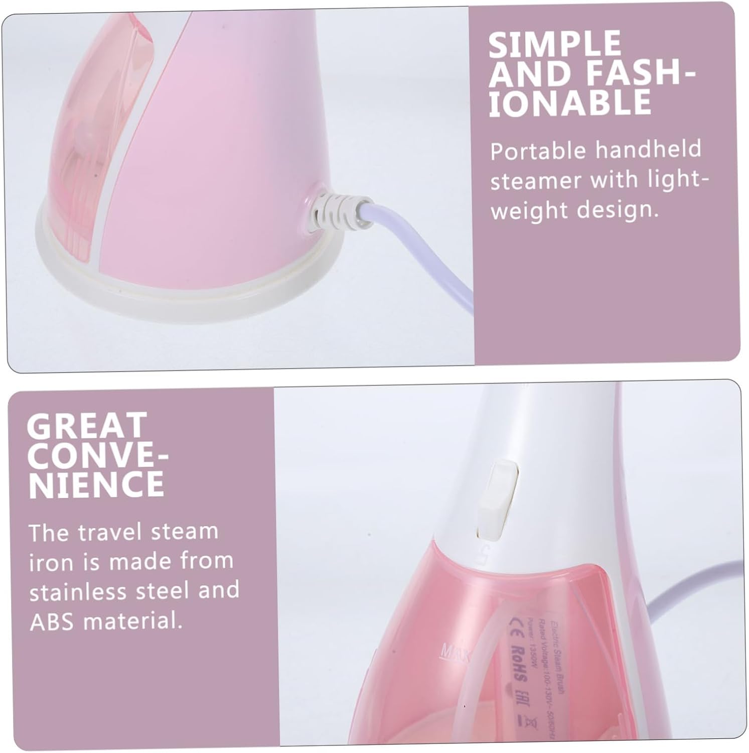 Package List 1 x Steamer Features -Rated frequency: 50 (HZ) clothes steamer handheld -Tank capacity: 300ml mini travel iron -Material:ABS steam iron for travel -Steam output: 30g/min professional steamer -Quick steam release time: 15S steam iron portable -Rated Power: 1500W wrinkle remover for clothes -Rated Voltage: 110V small portable iron - Size: 26.00X13.00X11.50cm/10.22X5.11X4.52in travel clothes steamer -Product Info:Handheld steam brush ironing machine - Color: Pink portable iron for travel - Made of ABS and stainless steel materials, the garment steamer is , and you can use it with steam iron for home - Can be used in different places such as during travel, or at home, hotel, dormitory, portable size for easy storage professional garment steamer - This steamer iron can help you to remove wrinkles for clothes of different materials easily and quickly cloth steamer for wrinkles - Easy to carry, portable size and with light weight, this steamer a very practical hand-held iron for travel or dorm steamer for clothes - No water leakage during use, and the temperature is proper, making it safe for both you and your clothes steam ironGoods Descriptionprofessional garment steamer Are you always troubled with wrinkled clothes when you are during the travel or business trip? Do you want to a portable clothes steam iron that can be carried for travel use? If yes, our mini travel steamer can meet your needs well.small portable iron Note: This item comes with US plug, please confirm the voltage of your area before purchasing