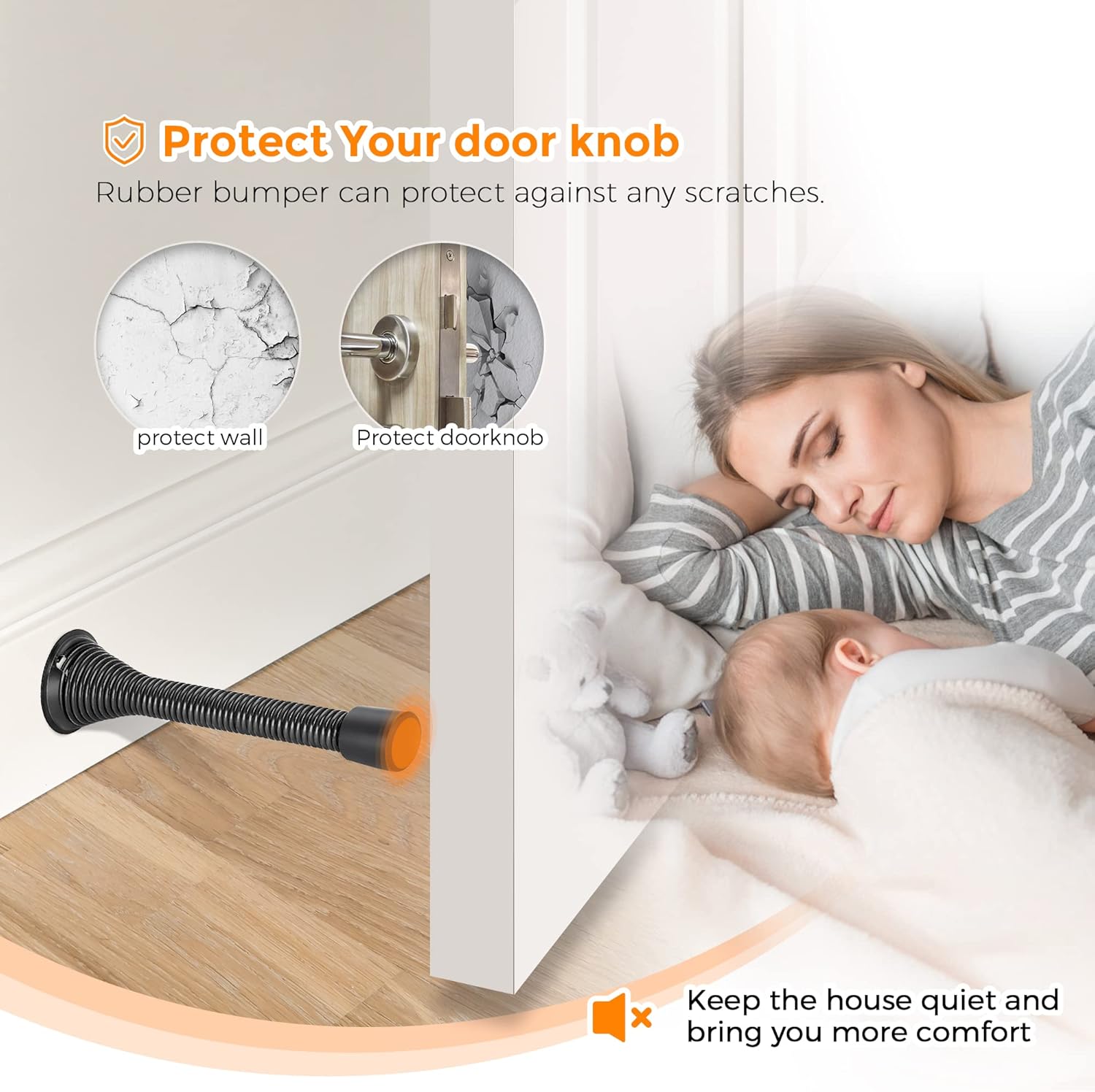 Our spring door stops restricts those heavy, fast swinging doors from slamming into your walls and creating those dreaded doorknob holes, while also safeguarding your wood, steel, and fiberglass doors from marks and scrapes. Spring door stops has special strong rubber protecting head, which can prevent scratches, and is strong and difficult to be replaced, which greatly reduces the risk of injury to the tip of the doorstop. - Rubber Bumper Tip It can protect against any scratches, also can keep the house quiet and bring you more comfort. - Stretch Spring It can better reduce the pressure caused by the door, has a buffering effect. - Super Easy To Install. The package has carrying screw accessories, which is very convenient for installation