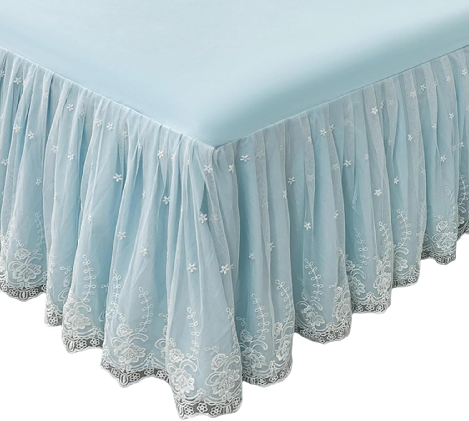 Two Sizes for you to choose:Queen and King;With 2 pillow case covers4 colors for you to choose;Material:Microfiber Polyester;Queen Size:Most suitable for Queen beds (80”L x 60”W), Drop: about 17.7";King Size:Most suitable for King beds (80”L x 77"W), Drop:About 17.7";Romantic ruffled bedskirts dust ruffle bedskirt with 2 lace layers,suitable for many styles Beds;decorate your bedding to complete its elegant look with this bed skirt and it's a good mattress protective cover,keep your bed dust-free and tidy.