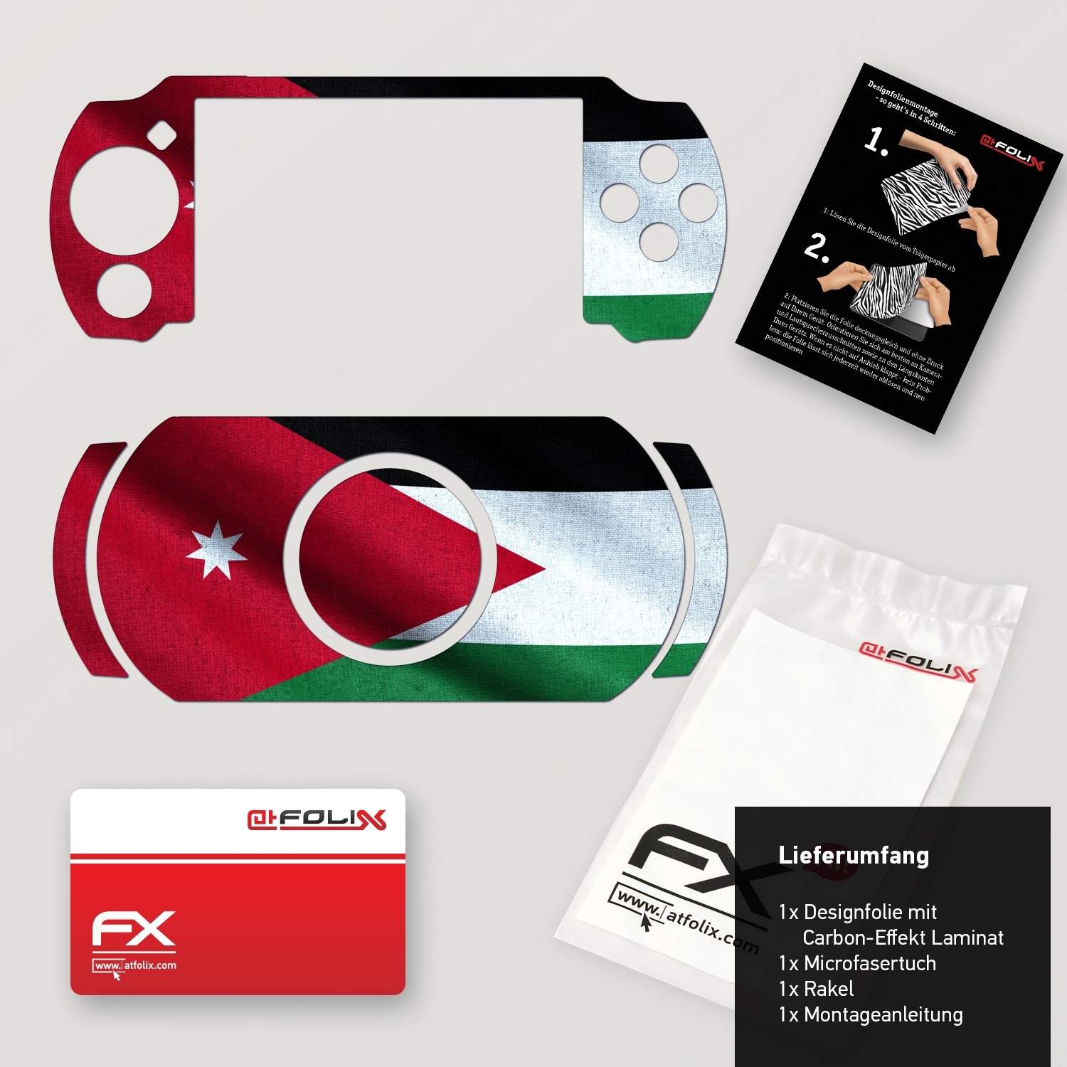 Sony PSP-E1000 / E1004 Design Skin (flag of Jordan Design)Make a unique impression with a unique print:With this skin from atFoliX your Sony PSP-E1000 / E1004 will always be appropriately decorated - and it will clearly show its owner's allegiance. With a continuously expanding range of unique designs, there are plenty of options available to choose from. You will be spoilt for choice.An eye-catcher in any situation - "oohs" and "aahs" guaranteedThe high-quality polymer-structured film offers your device the aesthetic enhancement you have been looking for, so it will no longer be dull to look at. Just like you.Long-lasting value - and relief for battered pocketsThe strong and robust polymer material offers extensive protection against scratches and dirt for the sensitive surfaces of your device - and the film is not nearly as cumbersome as, for example, a bulky case made from rubber, leather or plastic. Your pocket or handbag will be relieved!Scope of delivery1 x Sony PSP-E1000 / E1004 Decal Sticker - flag of Jordan Design with carbon-effect laminate1 x Micro-fibre cloth1 x Installation tool (scraper)1 x Installation instructions PSP-E1000 / E1004 Design Skin