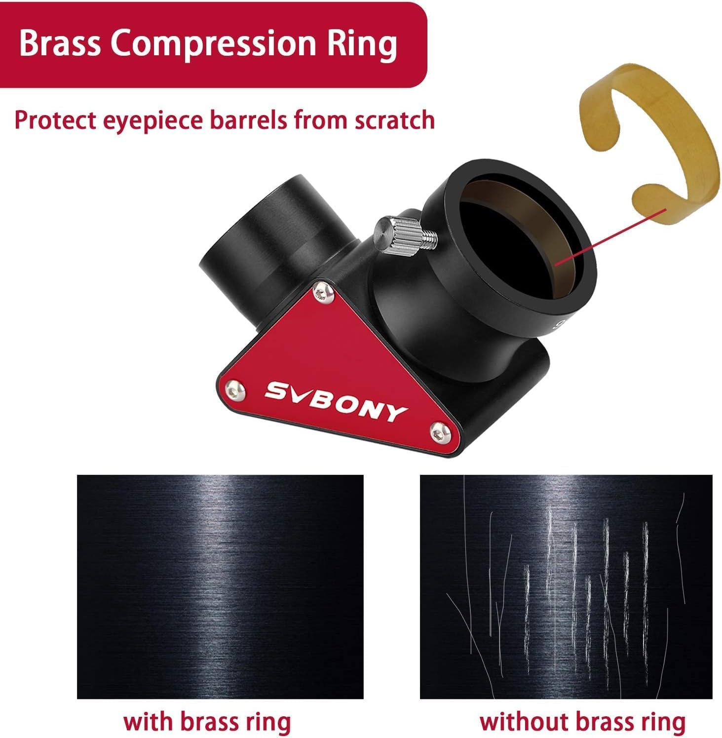 SV188P 1.25" nosepiece fits telescopes with 1.25in focusers. Accepts standard 1.25” eyepieces, filters, Barlow lenses and other accessories with a 1.25" insert barrel.For more comfortable overhead viewing through refractor and Cassegrain type telescopes.Correct upside down and left right reversed image. It will look like trying to read a sign in a mirror. Suitable for space viewing, for there is NO upside down or right side up in space.1.25" 0.5x Focal Reducer for Telescope Eyepiece Photography and Observing. A wonderful tool for astrophotography telescopes: reduce exposure time and simplify astrophotography, suitable for shooting. Capture wider field of view, the focal reducer is good for visual use for a bigger FOV and is indispensable when CCD imaging. The case is made of metal, which better protects the product itself and prolongs its service life.