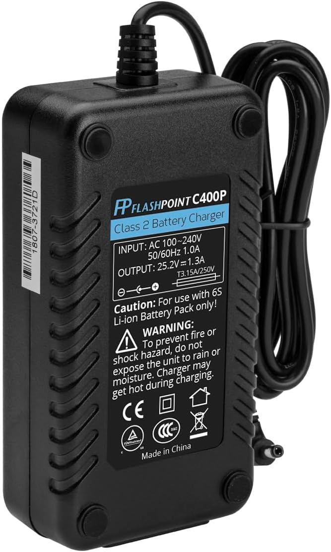 The Battery Charger for XPLOR 400 PRO (Godox C400P) is specifically designed to power up the Flashpoint Battery Power Pack Unit, a key component of the XPLOR 400Pro Series Monolight. This charger is essential for photographers who rely on the high-energy 21.6v 2.6Ah Lithium Ion 2600mAh battery, which is both internal and interchangeable. With the capacity to deliver over 390 full power flash bursts on a single charge, this battery charger ensures that your photography sessions are never interrupted. It recharges directly via the DC port on the battery, allowing you to continue your shoot with a fresh unit while the depleted power pack is charging. One of the standout features of this battery charger is its color-coded LED display, which clearly indicates the power status level of the battery, whether the monolight is on or off. This feature ensures that you're always aware of your battery's power status, helping you plan your shoots more efficiently. Designed with the global photographer in mind, the Battery Charger for XPLOR 400 PRO (Godox C400P) works worldwide, ensuring that you have the power to XPLOR, no matter where your photography adventures take you. This charger is an indispensable tool for professional photographers who use the XPLOR 400Pro Series Monolight, providing reliable, efficient charging for your high-energy Lithium Ion battery.