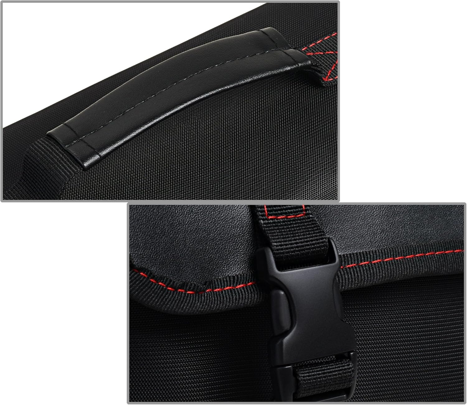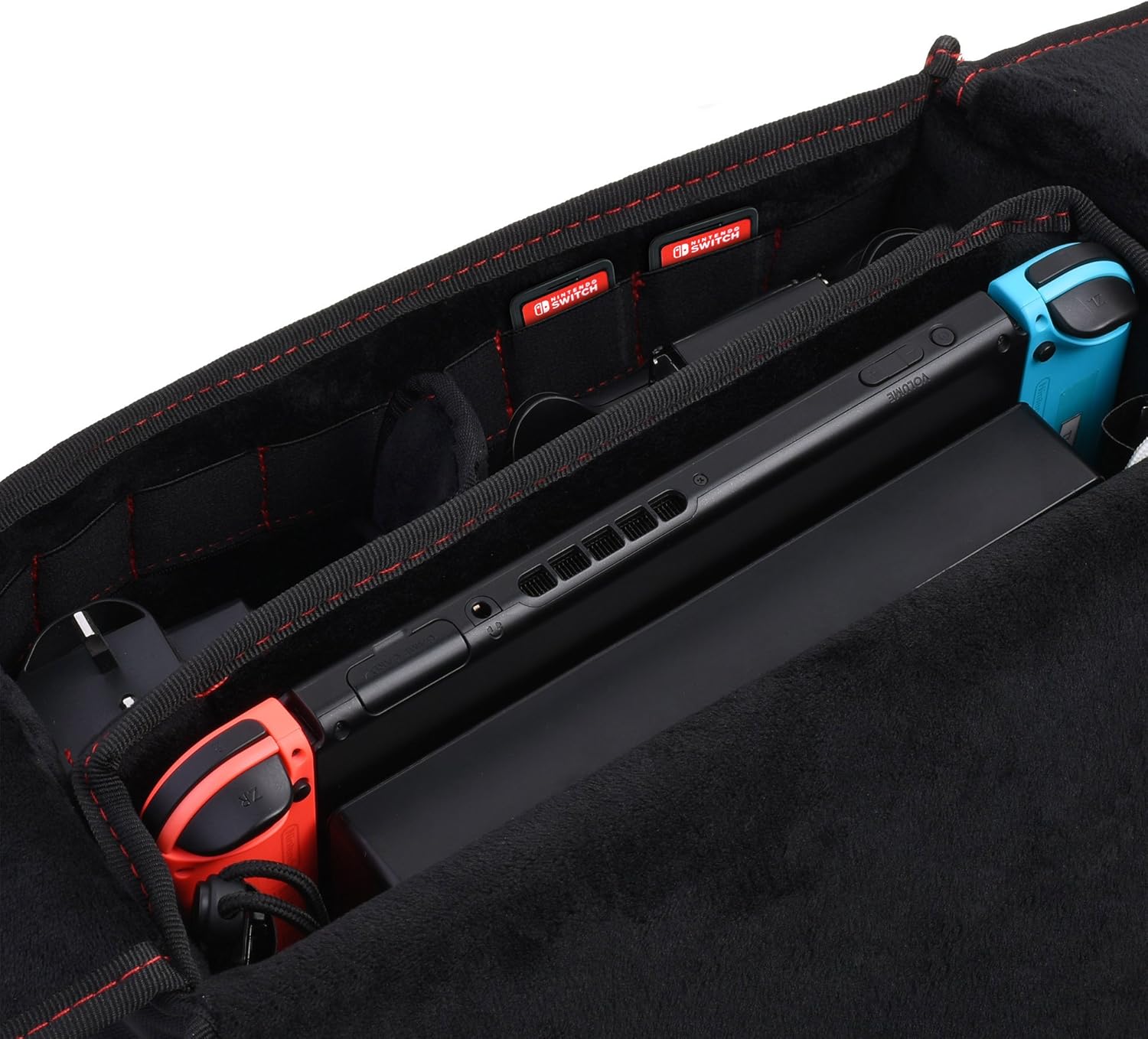 Compatible - Tailor designed for Nintendo Switch, Nintendo New3DS, Nintendo New 3DSLL, Nintendo 3DSL, Nintendo 3DSLL Dimensions - External Dimensions (L x W x H):4.65 x 10.85 x 5.35 Inches; Inner dimensions: (L x W x H):4.00 x 9.50 x 4.50 Inches Materials - Material: Nylon, Neoprene, Mesh, PU leather, PVC buckle and Velco Features - Stylish tailor-made design. Premium soft inner mesh compartments safely store the Nintendo Switch, Dock, Joy-Con Grip, extra Joy-Cons, charging cradle, AC adaptors with power cord, pro controller, console. Cables. Built in 9.7” long belt with multiple loops for storage of game card micro, SD cases etc. Stylish sleeve with closing/opening Velcro cover to double protection of storage items from falling out. Portable carrying with PU Handle grip. - Great for daily use storage and travelling
