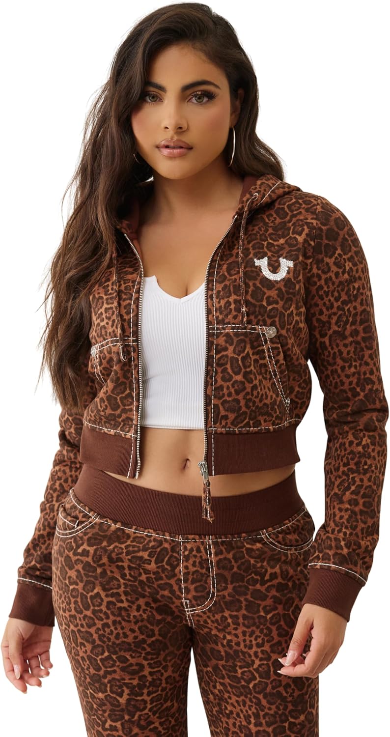 True Religion Women's Big T Crystal Leopard Shrunken Zip Hoodie. This cropped hoodie features eye-catching crystal rhinestone detailing and a leopard print patch design for a statement look. Designed with Big T contrast stitching, a full-zip front, and a fitted shrunken silhouette, it's a modern twist on iconic True Religion style. The fleece construction adds cozy comfort, making it a standout piece for everyday streetwear. Brand: True Religion Style: Big T Crystal Leopard Shrunken Zip Hoodie Fit: Shrunken/Cropped Detailing: Crystal rhinestones & leopard print patch Stitching: Signature Big T contrast stitching Hood: Adjustable drawstring hood Pockets: Split kangaroo pockets Trim: Ribbed cuffs and hem Care Instructions: Hand washable Closure: Full Zip-Front Closure Neckline: Crew Neck with Drawstring Hood Sleeves: Long Sleeves with Ribbed Cuffs