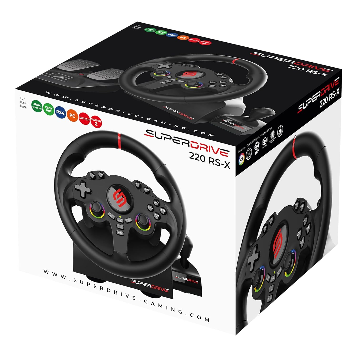 Transform your gaming experience with the Superdrive 220 RS-X steering wheel, a versatile racing controller compatible with Nintendo Switch 2, Switch, Xbox Series X/S, Xbox One, PS4, and PC. This racing wheel features a comfortable 8.7-inch diameter design with 180-degree rotation for precise control. The wheel comes equipped with dual analog joysticks featuring RGB LED lighting, programmable buttons with three sensitivity levels, and dual vibration motors for immersive feedback. Complete with a sequential gear shifter, paddle shifters, and an analog pedal set for acceleration and braking, this wheel delivers a realistic racing experience. The removable suction cups ensure stable mounting on any desk or table. Perfect for everything from serious racing simulators like Forza and Gran Turismo to arcade favorites like Mario Kart, this wheel combines accessibility with performance. The integrated controller functions through the dual joysticks make it versatile beyond just racing games. Note: This wheel is not compatible with PS5.