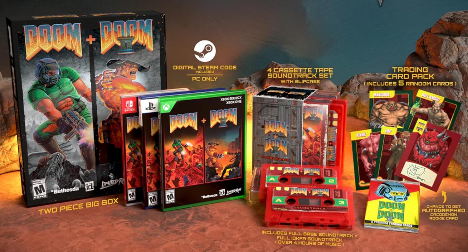 Developed by id Software, and originally released in 1993, DOOM pioneered and popularized the first-person shooter, setting a standard for all FPS games. The critically acclaimed sequel, DOOM II, followed in 1994. Now the definitive, newly enhanced versions of DOOM + DOOM II are available as a combined product.Includes:DOOMDOOM IITNT: EvilutionThe Plutonia ExperimentMaster Levels for DOOM IINo Rest for the LivingSigil & Sigil IILegacy of Rust (a new episode created in collaboration by id Software, Nightdive Studios and MachineGames)A new Deathmatch map pack featuring 25 mapsAltogether, there are a total of 187 mission maps and 43 deathmatch maps in DOOM + DOOM II.Two Piece Big BoxCassette Tape Soundtrack Set with Slipcase. Includes Base Soundtrack and full IDKFR SoundtrackTrading Card Pack includes five random cards New EnhancementsOnline, cross-platform deathmatch and co-op for up to 16 players¹In-game mod browser³Choose between the original midi DOOM and DOOM II soundtracks or the modern IDKFA versions by Andrew Hulshult (including brand-new DOOM II recordings) Now on the KEX engineBOOM source compatibility makes it possible for hundreds of community-created mods from the past 25 years to be published in-gameAccessibility options, such as a modern font to improve legibility, high contrast mode, text-to-speech, speech-to-text multiplayer chat and moreTranslated into 8 new languages: Mexican Spanish, Brazilian Portuguese, Polish, Russian, Japanese, Korean, Traditional Chinese and Simplified Chinese Existing EnhancementsUpgraded visualsModern controller supportWeapon carousel for faster weapon switchingGyroscopic aimingImproved mouse and keyboard controlsLocal split-screen deathmatch and co-op for up to 4 playersFeatured community mods¹'²'³, including REKKR, Revolution!, Syringe, Double Impact, Arrival, and more!60 FPS and native 16:9 support – up to 1080pRestored original in-game music using original hardwareQuick Save/Load supportDeHacked mod support # of Players: Single System 1-4, Local wireless 1-8, Online 1-16