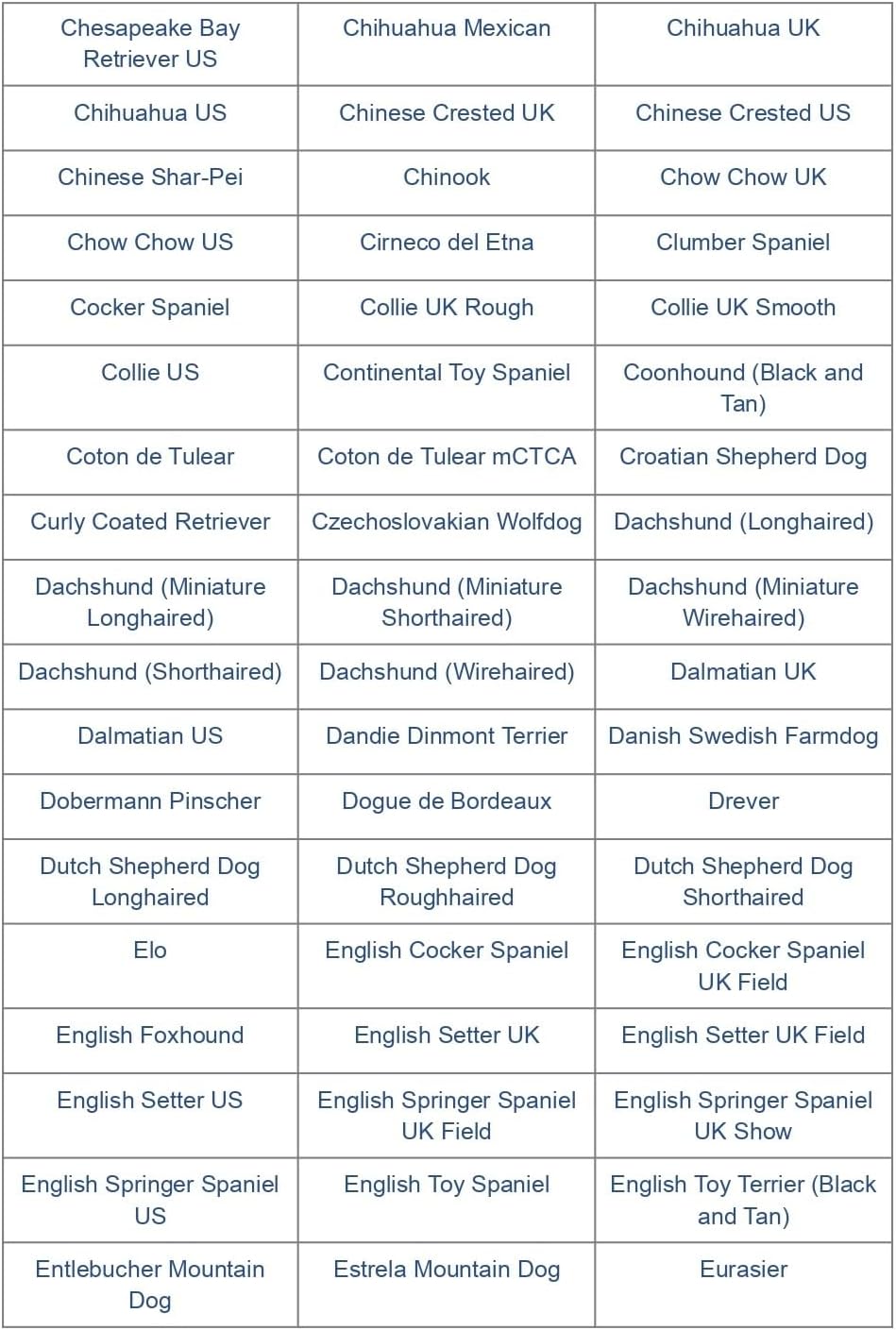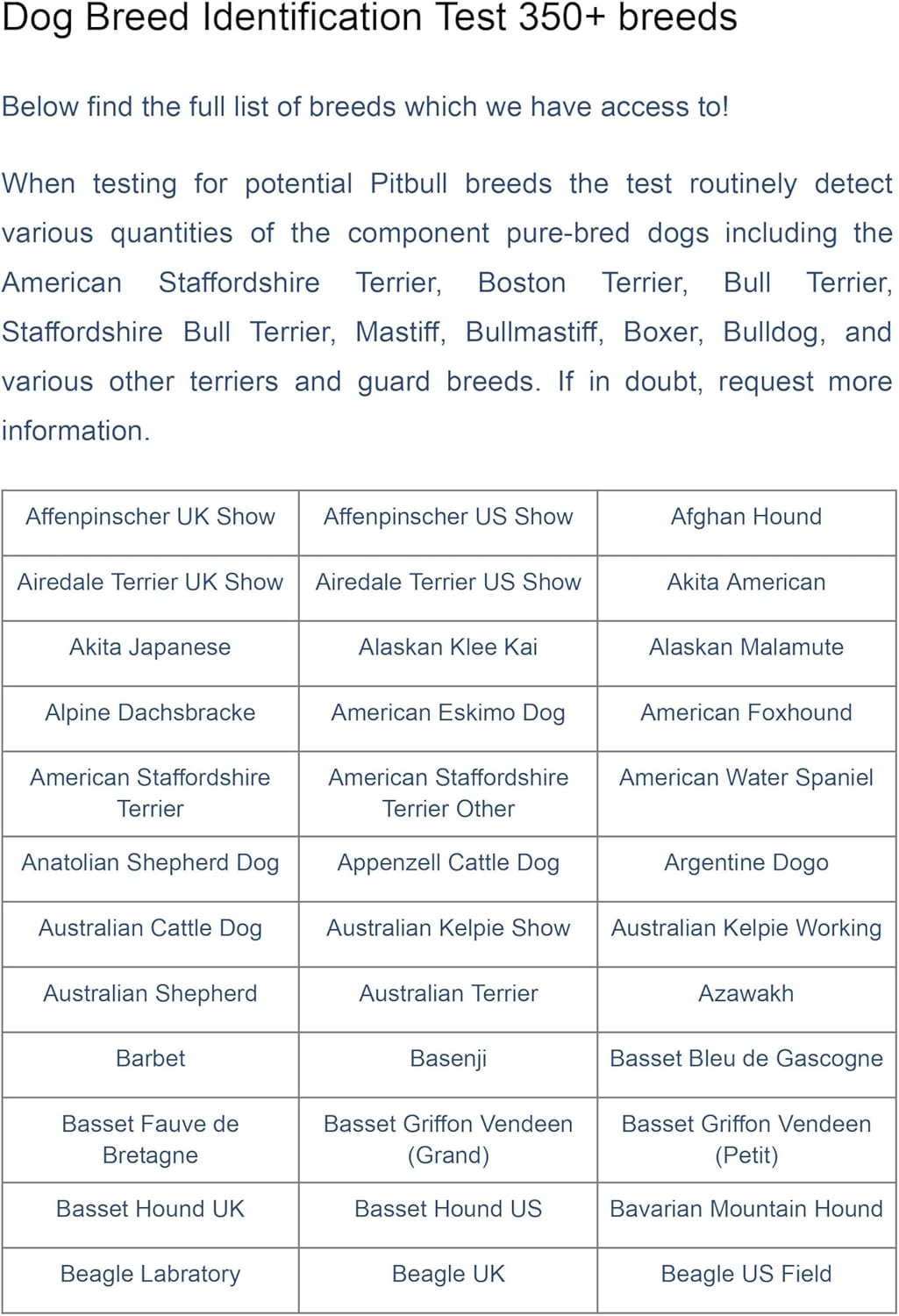 THE MOST ACCURATE DOG DNA BREED TEST: The DNA database covers more than 350 breeds, varieties and types and the laboratory tests more than 1800 genetic markers to determine which breeds are represented in your dog’s ancestry. COMPREHENSIVE DOG ANCESTRY TEST RESULTS: Results will be emailed 3 weeks from receipt of samples at the laboratory and will report your dog’s ancestry as a family tree going back 3 generations - parents, grandparents, great-grandparents together with breeds listed by percentage, predicted adult weight and genetic traits. Please see the images for extracts from an example report and a list of breeds covered by the test. BETTER HEALTH CARE & WELLNESS FOR YOUR DOG: Understanding your dog’s genetic breed makeup will help you provide better training, health care and identify their inherited behavioural traits. COMPLETE DOG BREED DNA TESTING KIT: The DNA sample collection kit contains step-by-step sample collection instructions, registration form, 2 cytobrush swabs and 1 return envelope. SAFE & EASY DNA SAMPLE COLLECTION: Hold the dog’s head firmly against your body with one hand. With the other hand, insert the cytobrush swab into the dog’s mouth and place it against the inside surface of the cheek. Firmly rub the swab against the inside of the cheek, rotating the swab for about 45 seconds. The objective is to collect loose cheek cells, NOT saliva. Please contact us with any questions.