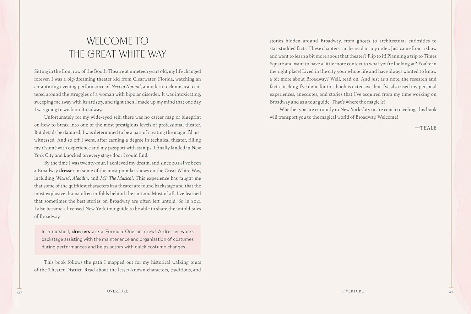 Go behind the scenes of the Great White Way with this illustrated guide to the Theater District’s hidden history--an essential book for your explorations of the district from a seasoned Broadway guide. Broadway is one of New York’s greatest treasures, and where there is treasure, there is a backstory. When it comes to Broadway, that backstory is fittingly juicy, dramatic, and unexpected. And no one knows these hidden histories like Teale Dvornik, who has been leading Broadway fans on tours of the theater district since 2017. With her immense knowledge and passion for the theater, Dvornik now takes readers on her one-of-a-kind tour of Broadway, “stopping” at each of the 41 theaters to tell us fun facts, lesser-known history, ghost tales, and interesting stories about actors, performances, stage flukes, blunders, and more, involving the biggest names and productions in theater history. Learn about the Tiffany chandeliers of the Belasco Theater, the trove of hidden jewels at the Gershwin (which houses years of history from the beloved musical Wicked), and the impresarios and players who influenced Broadway. Readers will also learn the fascinating back stories of theater myths, legends, and traditions. Where did the stage ghost light come from? What started the tradition of intermissions? Which theaters have secret connecting hallways? And much, much more! Along the way, Teale takes detours to explain stage lingo and dives into some of Broadways most popular shows, including CATS, Hello, Dolly!, and Rent. Read more