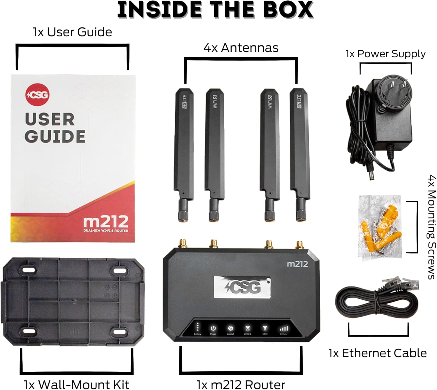 | BuiltIn Media | 1x Power Adapter & 1x Ethernet Cable, 1x User Manual and 1x Warranty Card, 1x Wall-Mount Kit, 1x m212 Router, 2x Wi-Fi Antennas & 2x 4G LTE Antennas |