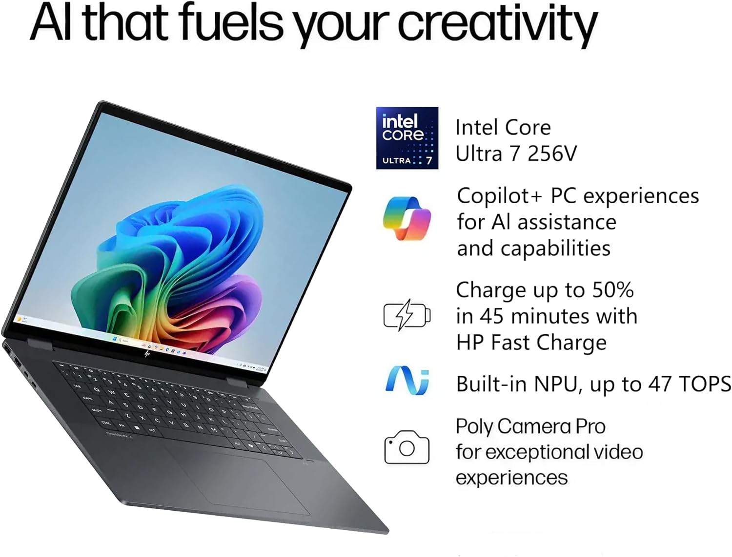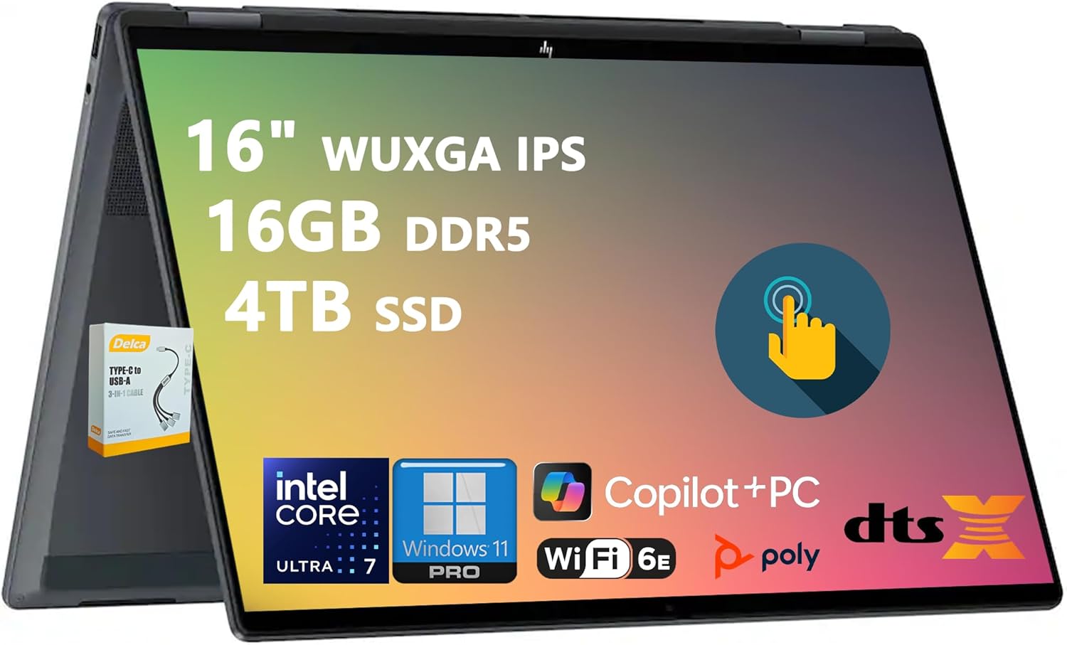 KEY SPECIFICATIONS: PC Type: Copilot+ AI PC PC Series: HP OmniBook X Flip Processor: Intel Core Ultra 7 Processor 256V (8 Cores, 12 MB Intel Smart Cache, 8 Threads, Up to 4.8 GHz with Intel Turbo Boost Technology ), Intel AI Boost (47 NPU TOPS) Memory: 16GB LPDDR5x Storage: 1TB SSD Graphics: Integrated Intel Arc 140V GPU Display: 16" WUXGA (1920x1200) IPS Touchscreen (400nits) Communications: Wi-Fi 6E + Bluetooth 5.3 Camera: 5MP IR camera with temporal noise reduction and integrated dual array digital microphones Audio: Poly Studio with dual speakers, DTS: X Ultra Keyboard: Backlit Keyboard Operating system: Windows 11 Professional Ports & Slots: 1x Thunderbolt 4 with USB Type-C 40Gbps signaling rate (USB Power Delivery, DisplayPort 2.1, HP Sleep and Charge)1x USB Type-C 10Gbps signaling rate (USB Power Delivery, DisplayPort 1.4a, HP Sleep and Charge)2x USB Type-A 10Gbps signaling rate1x Headphone/microphone combo1x HDMI 2.1 Additional Information: Dimensions: 14.02" x 9.67" x 0.61" Approximate Weight: 4.15 pounds