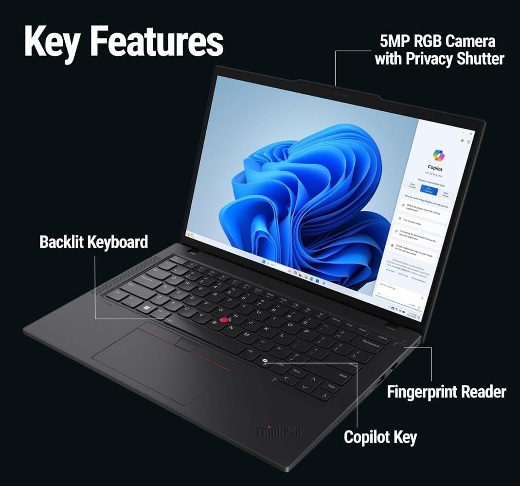 Processor: AMD Ryzen AI 5 PRO 340 Processor (2.00 GHz up to 5.00 GHz) Memory: 16 GB DDR5-5600MT/s (SODIMM) Storage: 512 GB SSD M.2 2280 PCIe Gen4 TLC Opal Display: 14" WUXGA (1920 x 1200), IPS, Anti-Glare, Non-Touch, 45%NTSC, 400 nits, 60Hz Camera: 5MP RGB with Microphone and Privacy Shutter Battery: 57Wh Rechargeable Li-ion Battery, supports Rapid Charge (charge up to 80% in 1hr) Fingerprint Reader WWAN None Connectivity: MediaTek Wi-Fi 7 MT7925 2x2 BE & Bluetooth 5.4 Graphics: Integrated AMD Radeon 840M Keyboard: Backlit, Black - English (US) QWERTY Docking Options: Various docking solutions supported via USB-C Ports: 1x USB-A (USB 5Gbps / USB 3.2 Gen 1) 1x USB-A (USB 5Gbps / USB 3.2 Gen 1), Always On 2x USB-C (Thunderbolt 4 / USB4 40Gbps), with USB PD 3.0 and DisplayPort 2.1 1x HDMI 2.1, up to 4K/60Hz 1x Headphone / microphone combo jack (3.5mm) 1x Ethernet (RJ-45) Dimensions: 12.44 x 8.81 x 0.43 inches Weight: Approximately 3.1 lbs Color: Black Warranty: One Year Onsite Operating System: Windows 11 Pro 64