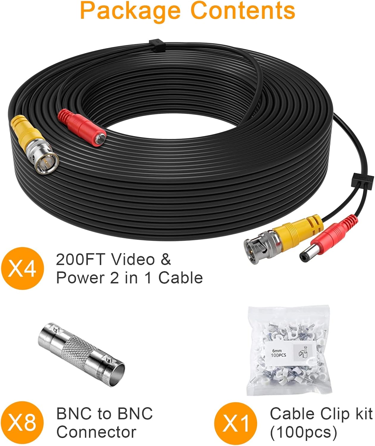 200ft 4Pack BNC Cable for All HD CCTV DVR Surveillance System.Nowaday it is the HD CCTV surveillance system time! Still with your old cables for new HD DVR systems in your home? The signal is not good enough with old cables?No problem,let us update to Pre-made All-in-one HD Cables(Power and video) for your new HD surveillace system!Make an easy connection between your surveillance cameras to your power supply and digital video recorder (DVR) with this cable,these are compatible with All major brand HD systems includinig the 720P,1080PN ,1080P,4MP HD CCTV surveillace DVR System .Features★Use with Closed Circuit Television (CCTV) applications and security camera components.★This bnc cable is perfect for transmitting video and power.★Simplify the installation of surveillance systems by using one cable to transmit video and power.★ Do not waste time soldering or crimping together your own cables or voiding the warranty by splicing in your own wires.Includes:4 x 200ft BNC Cable8 x Female Connectors