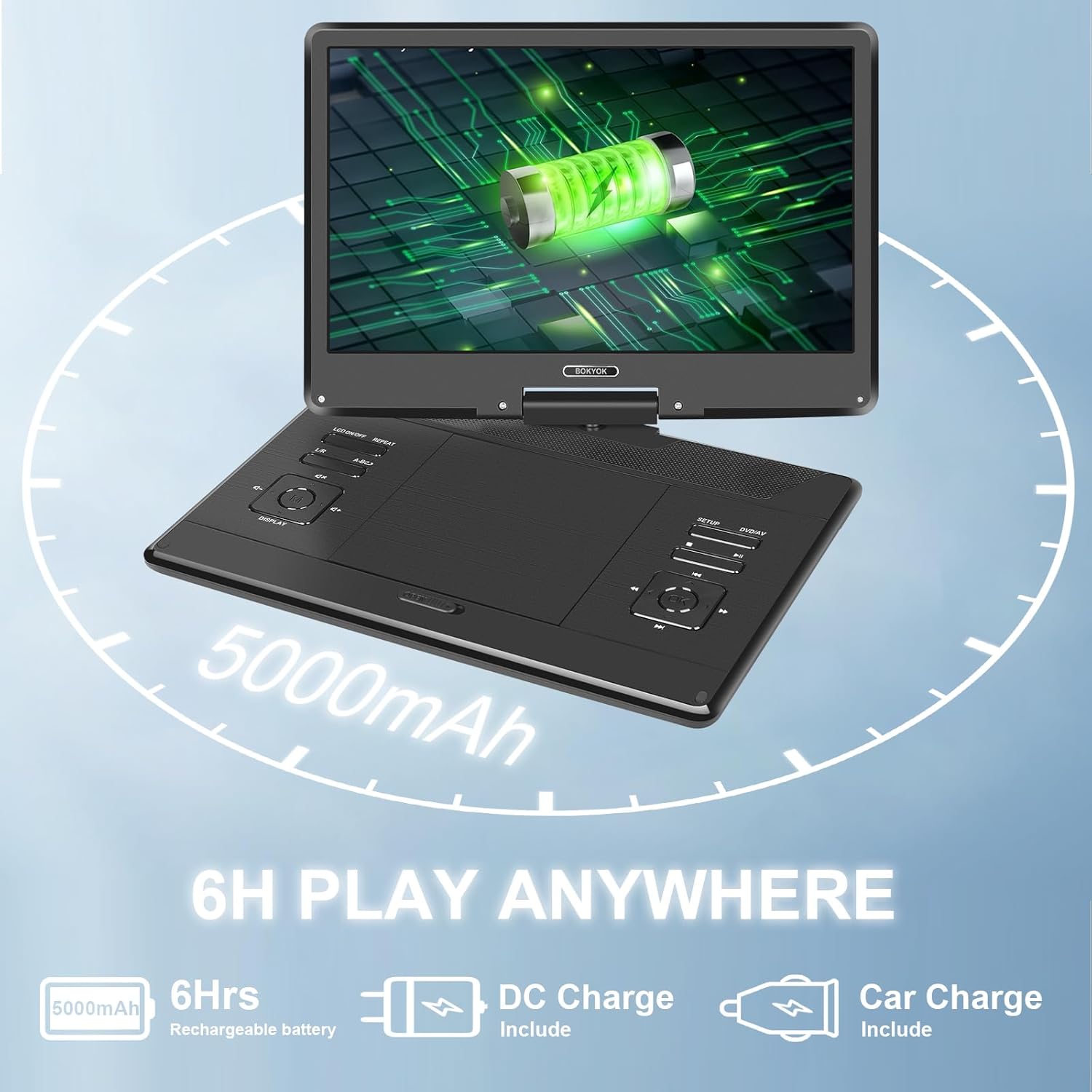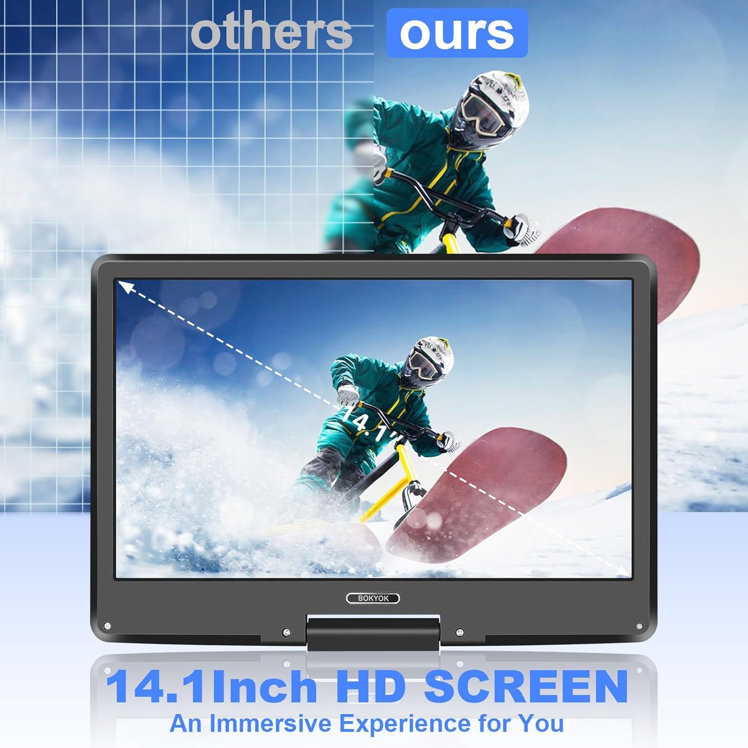 BOKYOK 16.9" Portable DVD Player with 14.1’’ HD Swivel Screen, 6Hrs Play, DVD Player Portable with Dual Speaker, Last Memory, Support SYNC TV/USB/SD Card, Play All Discs Format Except Blu-ray, Blac