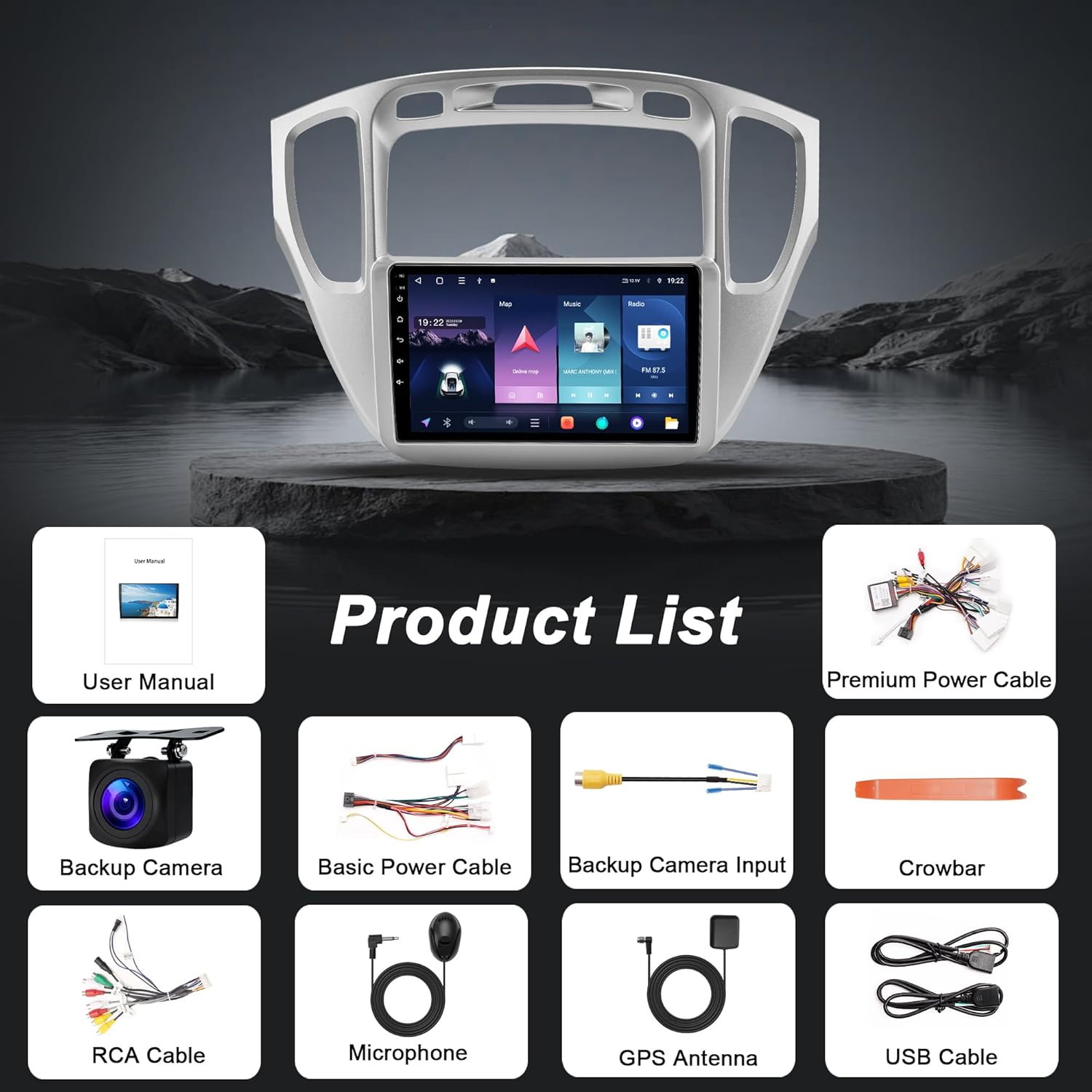 | BuiltIn Media | Head Unit, Backup Camera, USB Cable, Backup Camera Input, Microphone, Power Cable, Original USB, RCA Cable, GPS Antenna, Crowbar, User Manual |