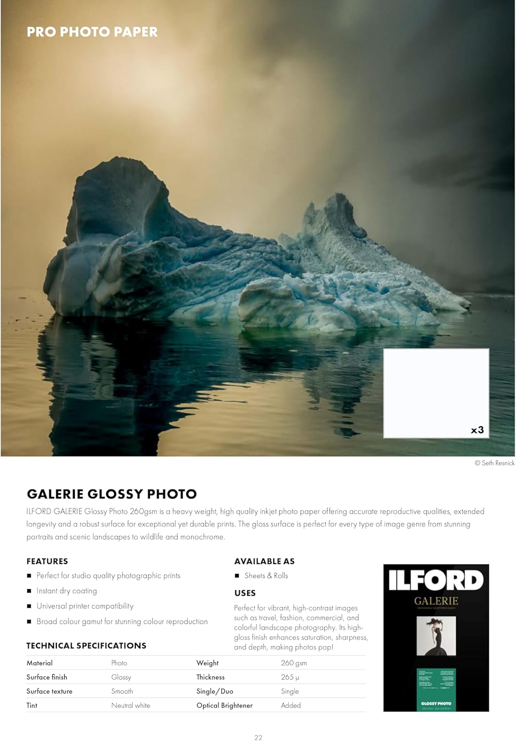 Introducing the pinnacle of photographic craftsmanship – a paper that transforms your prints into works of art. Made in Germany with archival-grade materials, this premium photo paper offers an inkjet printing experience unlike any other, whether you’re using dye or pigment-based printers. It features HDR optically clear coatings and an advanced inkjet receiving layer, ensuring your images burst with exceptional clarity, vivid colors, and breathtaking sharpness. Ilford’s Glossy Photo smooth surface offers a high-gloss finish with accurate color reproduction, extended longevity, and a robust surface for exceptional yet durable prints. It is perfect for high contrast images such as travel, fashion, commercial, and colorful landscapes. It's high-gloss finish enhances saturation, sharpness, and depth, making photos pop! Crafted for precision, the high-density resin-coated base is a robust 10mil thick with a 260gsm weight, designed for edge-to-edge printing with modern inkjet printers. Ready to use straight out of the box, it comes pre-cut to 5x7”, offering seamless compatibility for your most creative endeavors. Thanks to Instant Dry technology, your prints are smudge-free and ready to frame instantly, ensuring that your artistic visions are never delayed. With a clean, unbranded back, it’s the perfect canvas for personal or professional projects alike. For perfection with every print, Ilford also offers specially developed ICC printer profiles available for free download, ensuring your creations are captured in their truest form across a variety of printer models. Elevate your print experience to an art form with Ilford.
