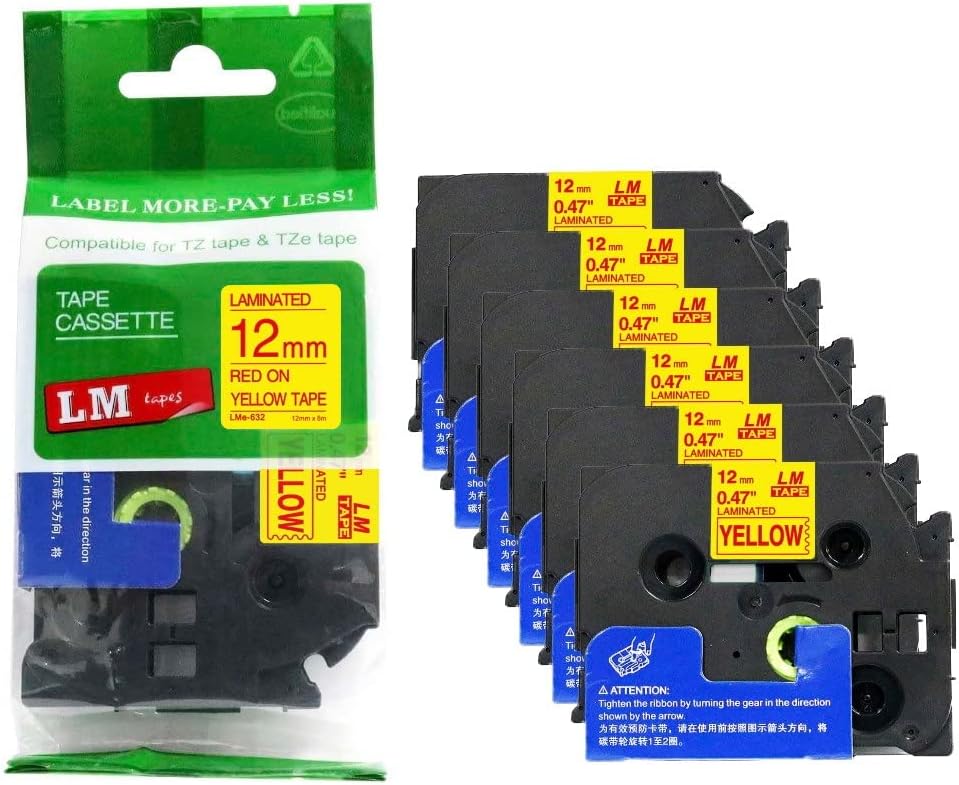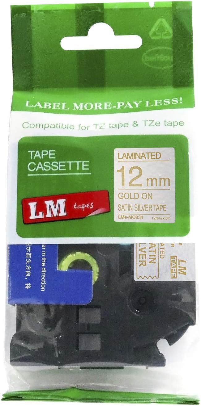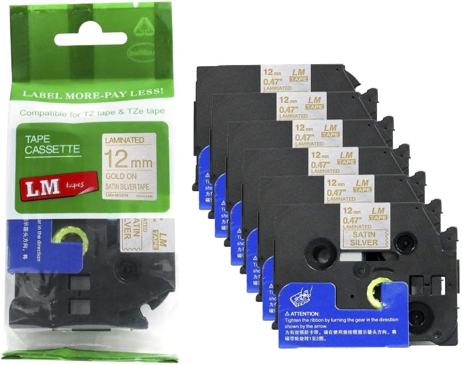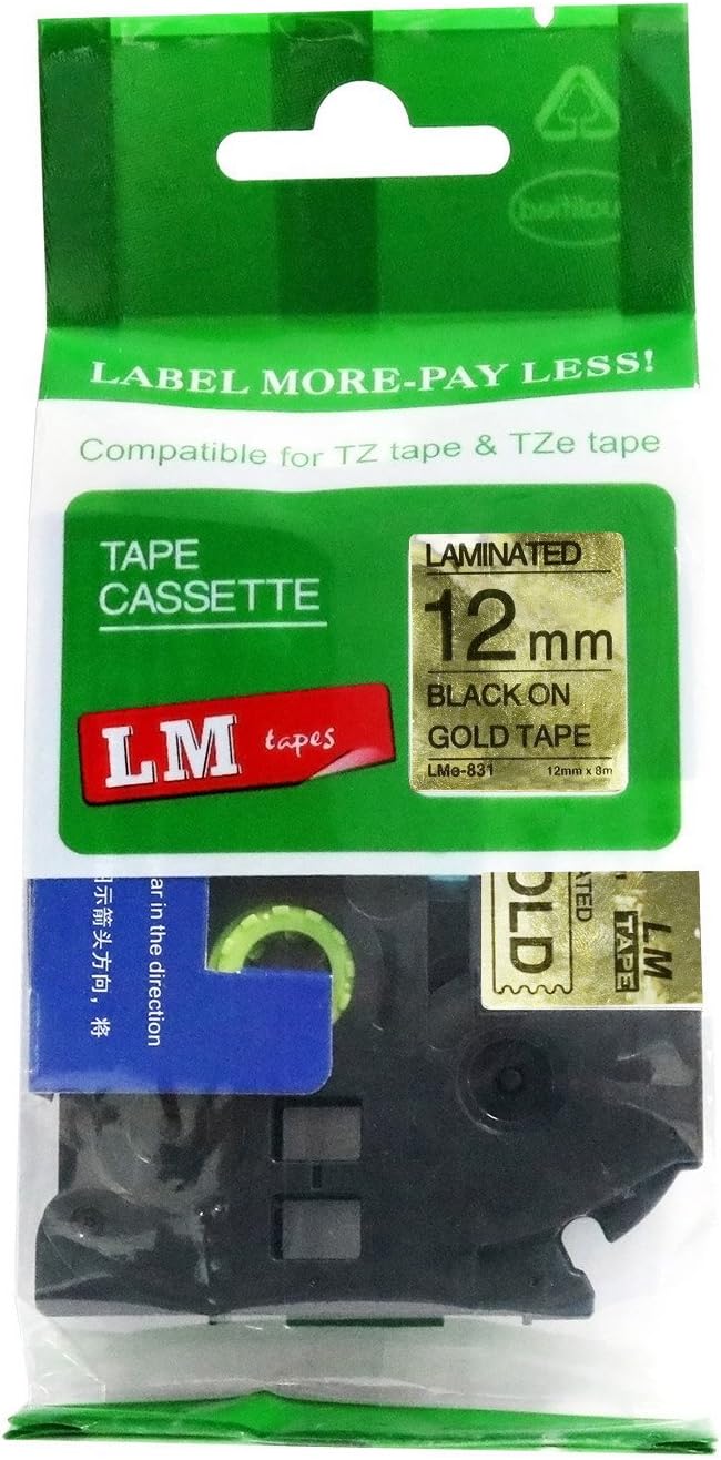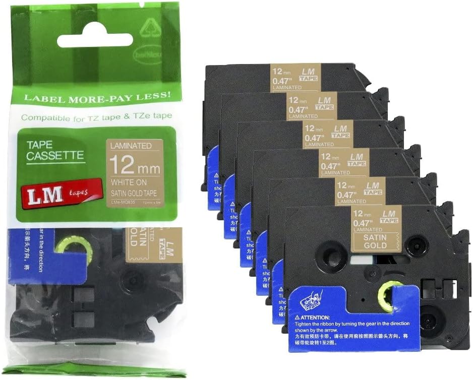 6/Pack LM Tapes LMe-234 Laminated 12mm Gold Print on White LabelThis Premium Compatible TZe-234 1/2" Gold on White tape is compatible with Brother P-touch label makers that use TZe series tapes but is not manufactured by or sold by Brother. This replacement laminated label tape is 1/2" (12mm 0.47) x 26.2' in length and can be used for both indoor and outdoor applications.These labels are rugged and will holdup in freezing temperatures as well has hot/sunny environments. They have regular strength adhesive and are best suited for smooth flat surfaces.For use in P-touch Models: PT18R, PT200, PT300, PT310, PT320, PT330, PT340, PT350, PT520, PT530, PT540, PT550, PT580c, PT1000, PT1010, PT1090, PT1090BK, PT1100, PT1100sb, PT1120, PT1130, PT1160, PT1170s, PT1180, PT1190, PT1200, PT1230PC, PT1280, PT128AF, PT1290, PT1300, PT1400, PT1500pc, PT1600, PT1650, PT1700, PT1750, PT1760, PT1800, PT1810, PT1830, PT1880, PT1900, PT1910, PT1950, PT1960, PT2030, PT2030AD, PT2030VP, PT2100, PT2110, PT2200, PT2210, PT2300, PT2310, PT2400, PT2410, PT2430PC, PT2500pc, PT2600, PT2610, PT2700, PT2710, PT2730, PT2730VP, PT3600, PT6100, PT7100, PT7500, PT7600, PT9200dx, PT9200pc, PT9400, PT9500pc, PT9600, PT9700PC, PT9800PCN, PTD200, PTD400, PTD400AD, PTD400VP, PTD450, PTD600, PTE100, PTE300, PTE500, PTE550W, PTH100, PTH101C, PTH105, PTH110, PTH300, PTH300LI, PTH500LI, PTP700, PTP750W, PTP900W, PTP950W, ST5, ST1150, ST1150dx