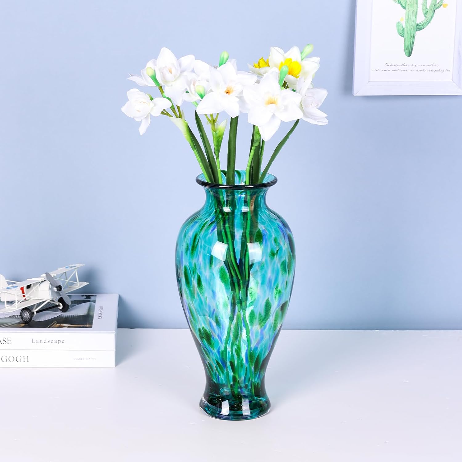 Discover the charm of the perfect blend of art and craftsmanship - texture and elegance stand out with the teal tones of the embellished greener base; the elegant greener color is complemented by the sprinkled teal, adding a touch of modern elegance to your home environment. From the subtle color transitions to the precise styling, every detail has been carefully crafted by artisans to highlight its high quality and unique value. Whether placed in the center of the living room, as a dining room accent, or as a bedroom decoration, it is sure to become a striking focal point. In addition, it makes an ideal gift for family, friends or colleagues, especially for those who appreciate unique handcrafted items and contemporary design. Size: Height: 11.8 inches/30 cm Diameter: 5.9 inches/15 cm Mouth width: 2.5 inches/6.5 cm Material: premium hand blown glass premium hand blown glass Package Contents 1 x handmade art glass vase Attention Each product is made by glass blowing process, the existence of individual bubbles is normal, not a defect. When cleaning, please wipe gently and avoid using a hard brush.