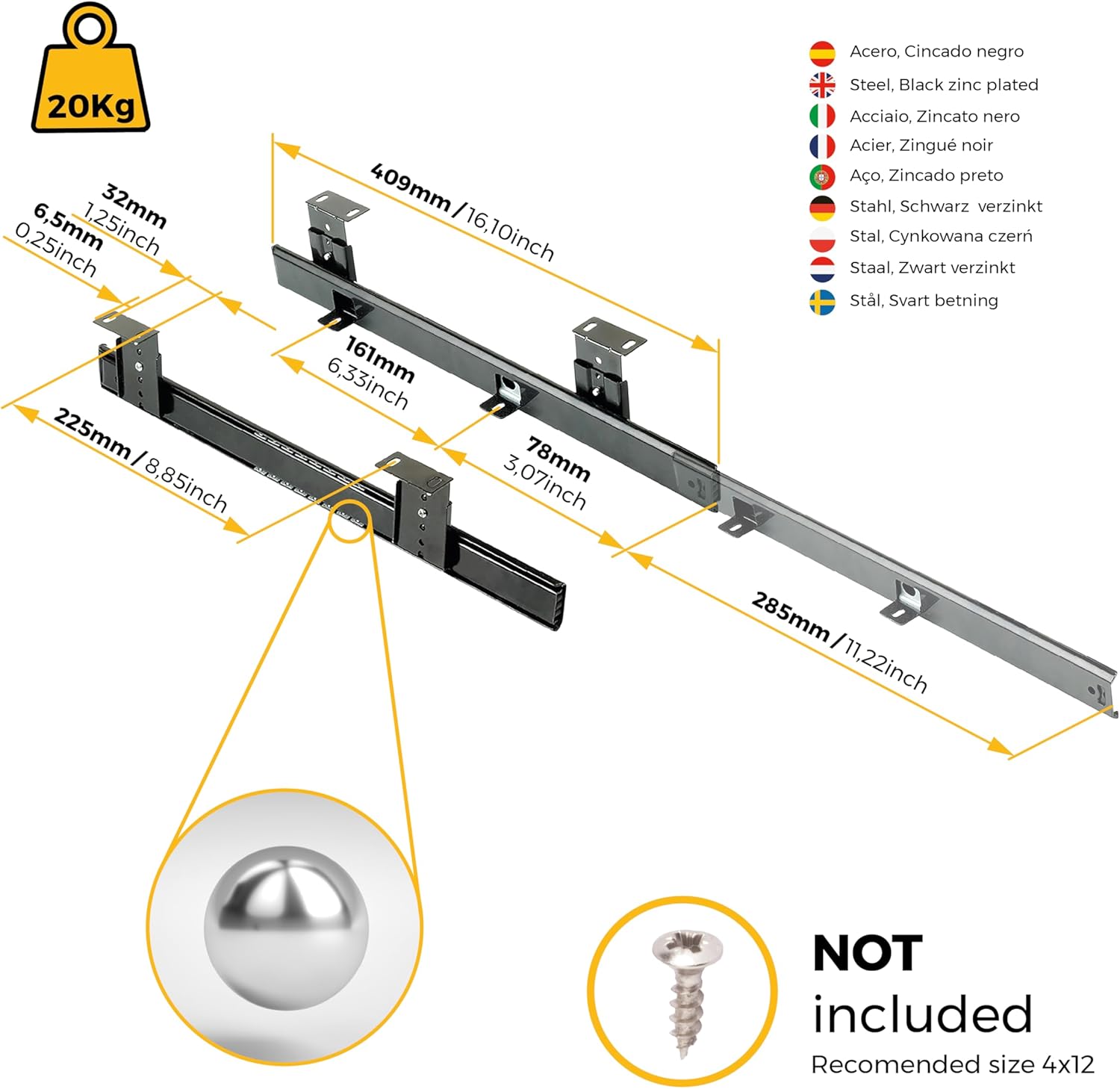 Set of runners for sliding keyboard support with height adjustment from 55 to 90mm. Made of steel with black cinc plated finishing and ball-bearing. This hardware is perfect to build a customized extractible keyboard platform by only screwing a wooden pannel to the sliders's brackets. Optimise the work space on the table as the keyboard becomes totally hidden under the desk when not in use.