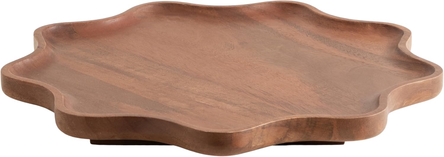 Introducing the Kate and Laurel Alezar wavy round Lazy Susan tray, your ultimate solution for efficient and stylish organization! This wavy Lazy Susan tray is a highly versatile accent that is great as a food-safe serving tray and gorgeous enough to showcase as kitchen decor. Maximize your storage space while adding a touch of transitional elegance to any room in your home. Say goodbye to the hassle of rummaging through cluttered cabinets; simply give the tray a gentle spin, and everything you need is right at your fingertips. The smooth rotation ensures effortless movement, while the sturdy base keeps your items secure, preventing accidental spills. Crafted from solid mango wood, the scalloped Lazy Susan organizer guarantees durability and long-lasting performance. The light bleached wood finish complements a wide range of decor styles, from contemporary to Scandinavian, making it a versatile addition to your home, office, or workspace. This circular organizer is not just limited to the kitchen; it's perfect for bathroom cabinets, office desks, or even as a centerpiece on your dining table. Arrange condiments, spices, and cooking essentials in the kitchen, or keep toiletries, beauty products, and cleaning supplies in order in the bathroom. With its versatile functionality, the Alezar Lazy Susan is a must-have for organizing and decluttering any space. The overall dimensions of this rotating tray are 18 inches in diameter with a height of 2.5 inches.