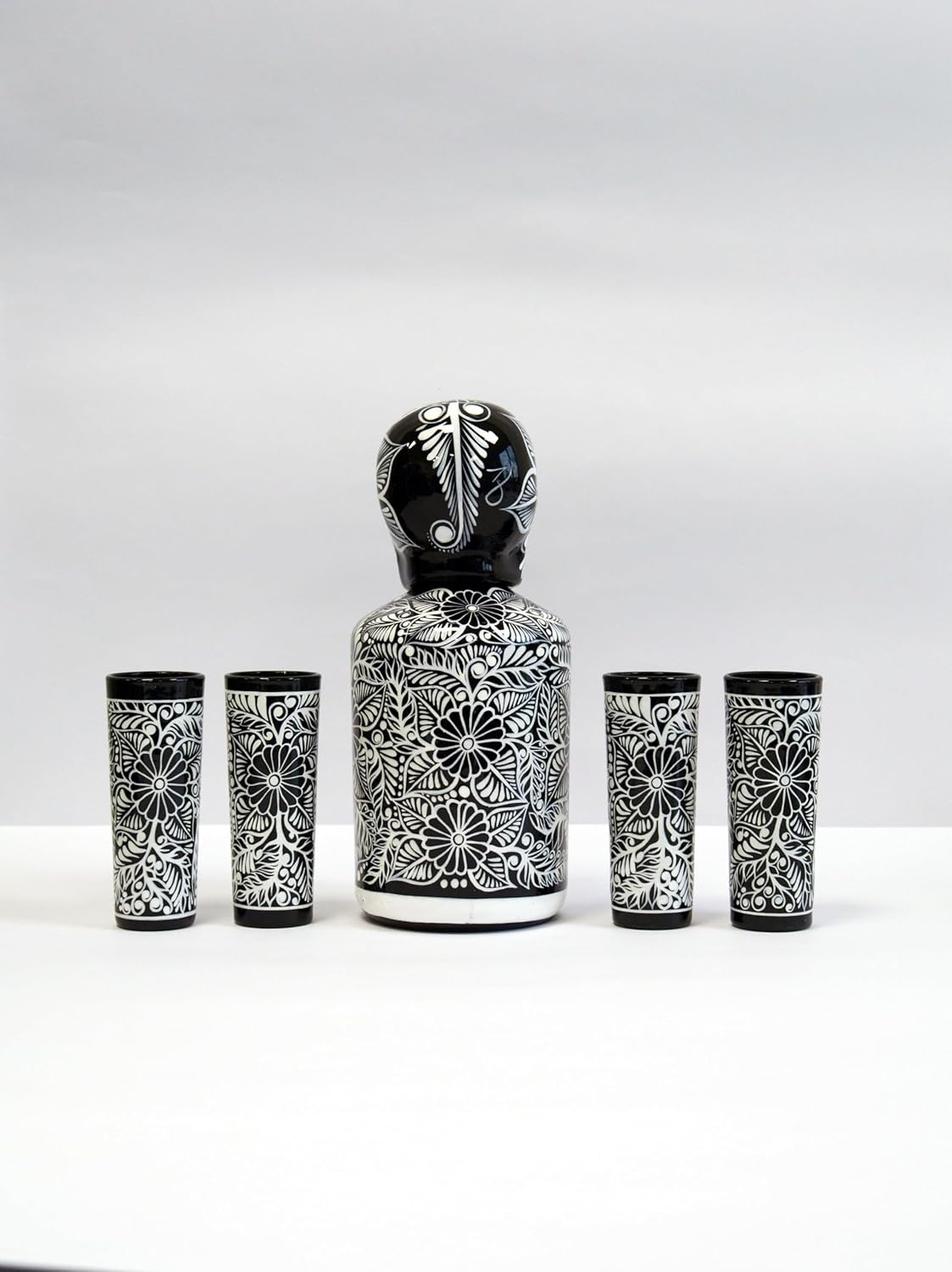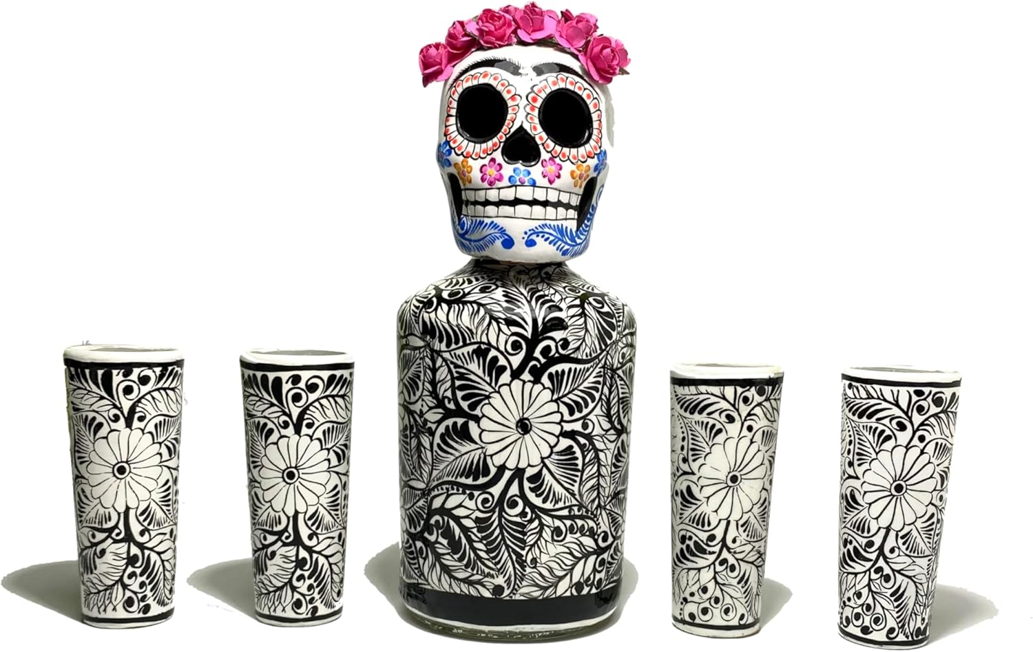 ✅SET: Our tequila decanter comes with 4 shot glasses, a decanter, a skull, a cork and a mexican sombrero. The shot glasses hold 2 oz (60ml). The decanter holds 25 oz (740ml). ✅PREMIUM QUALITY: One-of-a-kind hand-painted decanter set, skillfully crafted by artisans in Mexico. The delicate process for the elaborate design of this bottle and the shot glasses takes the artisan many hours to complete. The head of the bottle is a skull made out of clay and it's signed by the artist. The bottle is not only a decoration but it also has the functionality to be filled with any desired liquid transforming this piece of art into a beautiful utility. ✅UNIQUE PRODUCT] ]:This unique decanter set features a Mexican sugar skull design and will undoubtedly enhance your drinking experience while making a bold impression. Our exquisite tequila decanter is designed for the moment and will be a gift that will elevate any home bar into a respect-worthy collection! The sturdy glass on the tequila decanter preserves your beverage's crisp, rich texture for a fresh taste every time. ✅ PREMIUM MATERIALS: 6 Piece Tequila decanter set is made from glass and the skull is made of clay. The hand-painted design has a varnish finish giving it a smooth and elegant shine. This bar tequila set keeps your drink safe and easy to clean, recommend hand wash. NO DISHWASHER. ✅THE PERFECT BAR SET: Our tequila decanter set will elevate your bar! It's a must have bar accessory to give your bar a premium feel! The Tequila decanter set fits well for every type of celebration. Best vintage presents for whiskey lovers on their birthday, anniversary or wedding. Unique Christmas gifts for men