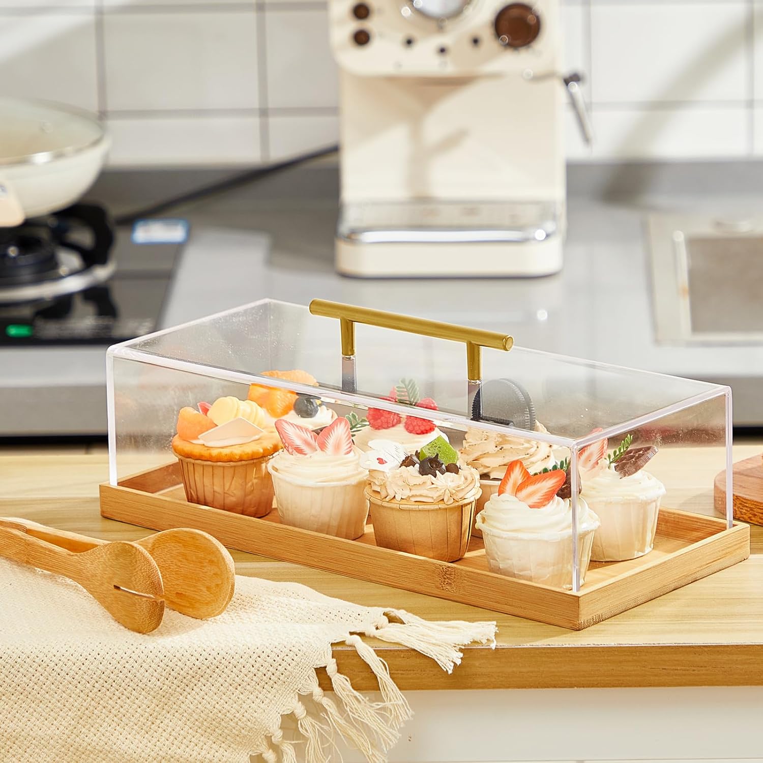 Features: Elegant color scheme: Suitable for most banquets and dessert shops. Separate use: Rectangular cake tray, acrylic display case and serving tong all can be combined or applied separately at will. Specifications: Material: acrylic, bamboo Color: clear, light wood color, gold Size: approx. 14" long x 6" wide x 4" high Package includes: 1 x Bamboo rectangular cake tray 1 x Acrylic display case lid 1 x Bamboo serving tong 1 x Screwdriver Notes: Manual measurement, please allow slight errors on size. The color may exist a slight difference due to different screen displays