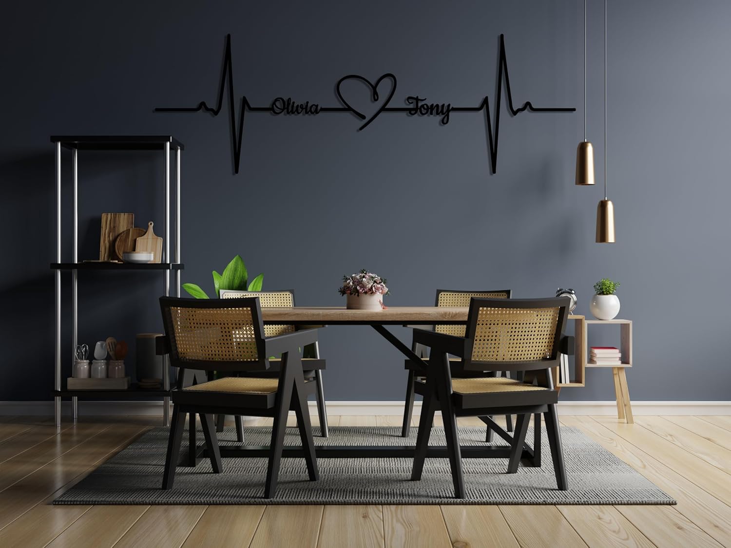 Metal Customized Names Heartbeat Sign, Personalized Heart Names, Valentine Day Gift for Couple, Heartbeat Metal Wall Art, Metal Gift for Her TOP QUALITY : No harmful substances, non - toxic, safe for humans and animals. 1.5mm best quality steel with electrostatic matte black paint. Waterproof. You can use it indoor and outdoor. ORIGINAL DECORATION : Metal wall art is a modern art that will always attract and admire your visitors and you. New fashion of your home by DecoSoul. Best decoration idea for living room, bedroom, dining room, TV background wall, kitchen, hallway and office. Suitable for country house, apartment, modern house, rustic house, and ranches. MEANINGFUL GIFT : The laser-cut details of flowers wall art is sure to catch the eyes of your family and friends. It’s ideal as a gift for housewarming, weddings, or other special occasions.