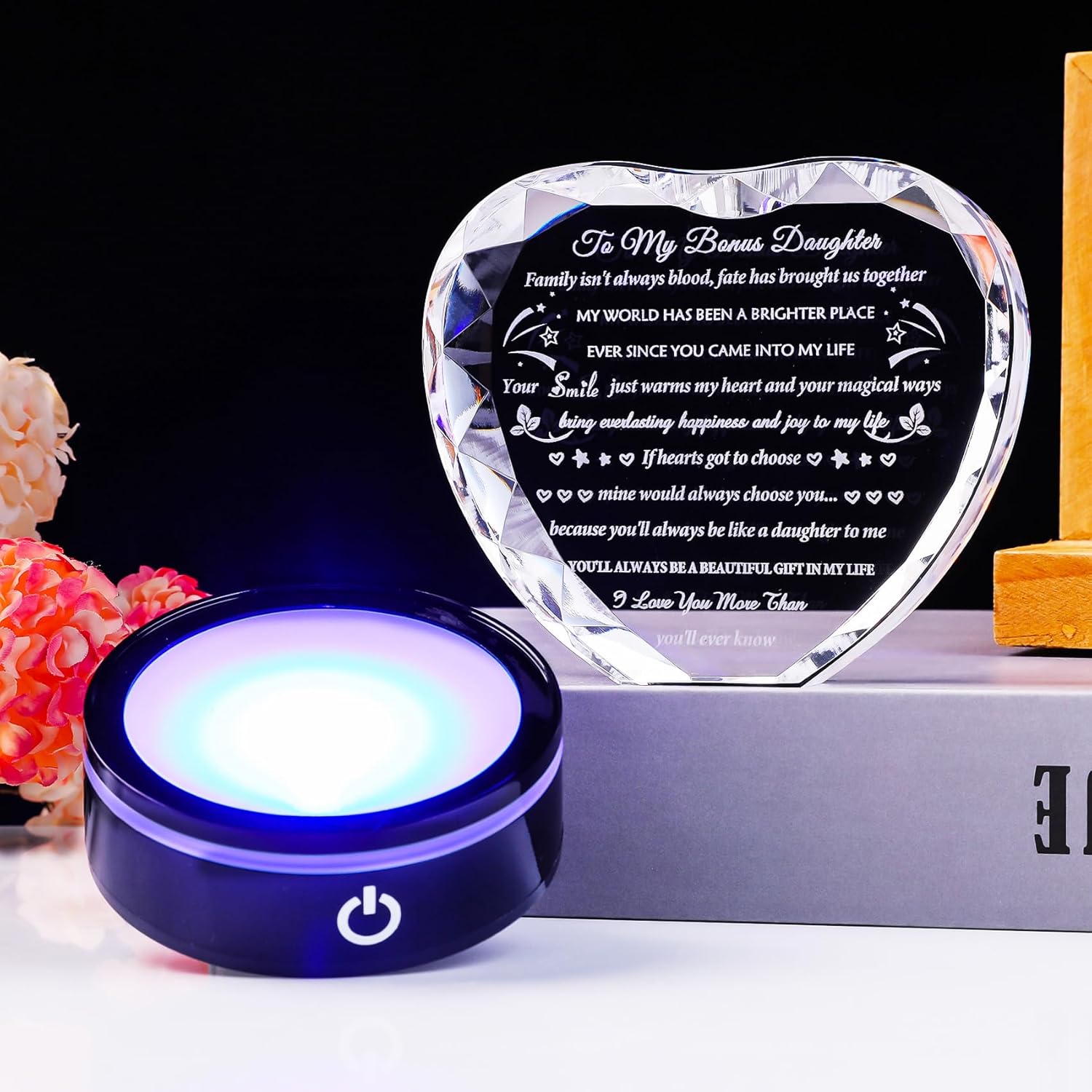 TO MY BONUS DAUGHTER Family isn't always blood, fate has brought us together. My world has been a brighter place ever since you came into my life. Your smile just warms my heart and your magical ways bring everlasting happiness and joy to my life. If hearts got to choose, mine would always choose you. Because you'll always be like a daughter to me. You'll always be a beautiful gift in my life. I Love You More Than you'll ever know❤[Want To Put A Smile On The Face Of Your Bonus Daughter? ]❤ ☀ Look no further because the heartfelt gift-ready are ensured to make her surprise! ☀ We promise, the look on her face will be priceless! ☀ Your daughter will be very touched and love the moving quotes on the keepsakes. 🎁[Bonus daughter Gifts From Mom and Dad]💕 ☀ You will receive so many compliments when you bring this keepsake to her. ☀ It is an awesome gift that makes her a unique own keepsake. ★[Let The Surprise Moment Leave A Good Memory]: ☀ Our specially-unique keepsake is engraved with funny & meaningful words, and conveys your love fully. ☀ She will remember your surprise gift when she sees it on the desk. [The Details Of Keepsake]💖 ★ Measures: 4.33" x 3.94"x 1.18. ★ Premium quality heart-shaped crystal with delicate cut facets for sparkling brilliance ★ Stands freely on its own, also can with led base ❤【Shopping NO RISK】❤ ☀ Special process to ensure that the engraving does not fall. ☀ We back our Motivational Gift with 100% Money Back, friendly Customer Service, to help you buy with confidence.