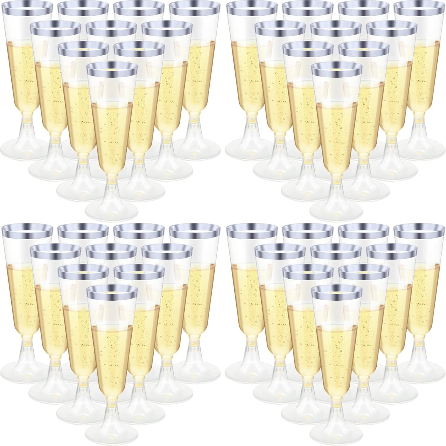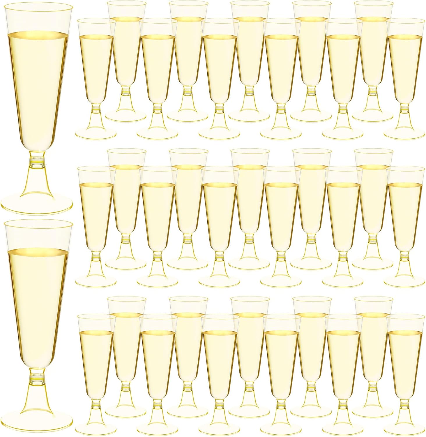 150 Pieces champagne flutes plastic champagne glasses disposable champagne flutes 5 oz wine glasses plastic for toasting flutes party cocktail cups wedding partiesFeature:Easy to store:When the flutes of these disposable champagne cups are separated from the base, they can be conveniently stacked together to reduce storage space on cupboards, drawers and kitchen counters, and large packages can also take up little space for storage. Convenient for party and wedding preparations. Can't use all 150 items in one collection? No problem. Stack the extra cups on top of each.Shatterproof and reusable: These plastic champagne glasses are unbreakable and do not produce broken glass fragments, making these cups a safe choice for parents, grandparents and older family members with children or infants. If you choose not to reuse them, simply throw them in the bin, allowing you to celebrate without washing up.Specifications:Quantity: 150 piecesMaterial: plasticColor: clearTop width: approx. 2.1 inch/ 5.3 cmMachine base width: approx. 2.36 inch/ 6 cmHeight: approx. 6.38 inch/ 16.2 cmWeight: approx. 15 gPackage includes:150 x Disposable plastic champagne flutesWarm notice:Not suitable for boiling hot liquids, dishwasher use, or microwave use.