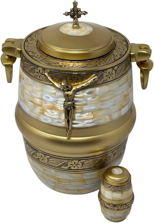 angelAngie Keepsake Urn for Human Ashes There are no words to understand your loss and how you are feeling. We comprehend that it could be a stressful time for choosing the sacred place where you and your family will keep the earthly remains of your cherished dad, mom, or loved one. angelAngie cremation urn for adult ashes is made from solid aluminum painted with a beautiful and elegant white mother pearl with gold finish; Its detailed and good-looking engraving designs, cross on the top and thorough figure of Jesus Christ give it a simple, elegant, and conservative catholic style suitable for memorial service, burial, funeral, columbarium, cremation niche and decorative urn for home decor. This catholic burial urn for human ashes has a large capacity of 200 cubic inches; it can hold adult women or men's remains with a weight of up to 200 pounds before the cremation. You can also be confident the remains of your loved one are safe, this metal urn will not break, and the screw lid ensures reliable and secure closure. Main Features: - Material: Solid Aluminum - Color: White Mother Pearl - Security closure: Screw lid. - Simple and elegant design. - Dimensions: 11 High X 7 Wide X 24 Diameter inches. - Capacity: 200 cubic inches. The Package Includes: - Catholic set of two keepsake urn for human ashes. - Double size memorial gift certificate. - Protective velvet bag. Finally, if you have any other questions about our cremation urn, please do not hesitate to contact angelAngie LLC at any time. Returns are accepted in case you are not completely satisfied. Thanks