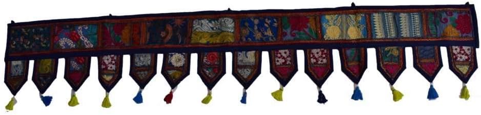 Transform your living space with this exquisite handmade Toran, a traditional Indian door valance that brings vibrant cultural artistry to any room. This stunning piece features intricate patchwork designs combining various patterns, colors, and textures, creating a mesmerizing mosaic effect. The multicolored embroidery work showcases beautiful floral motifs, geometric patterns, and traditional Indian designs, all meticulously crafted on a warm golden base. Adorned with charming tassels that add movement and whimsy, this Toran makes a perfect decorative accent for doorways, windows, or as a unique wall hanging. The detailed handicraft includes shimmering embellishments and delicate needlework that catches light beautifully. Each patch tells its own story through varied textile techniques, creating a harmonious blend of colors including turquoise, coral, red, and cream. This versatile piece works wonderfully in bohemian, ethnic, or eclectic interior settings, adding character and artistic flair to your home decor. The traditional design elements combined with contemporary appeal make it a timeless addition to any space.