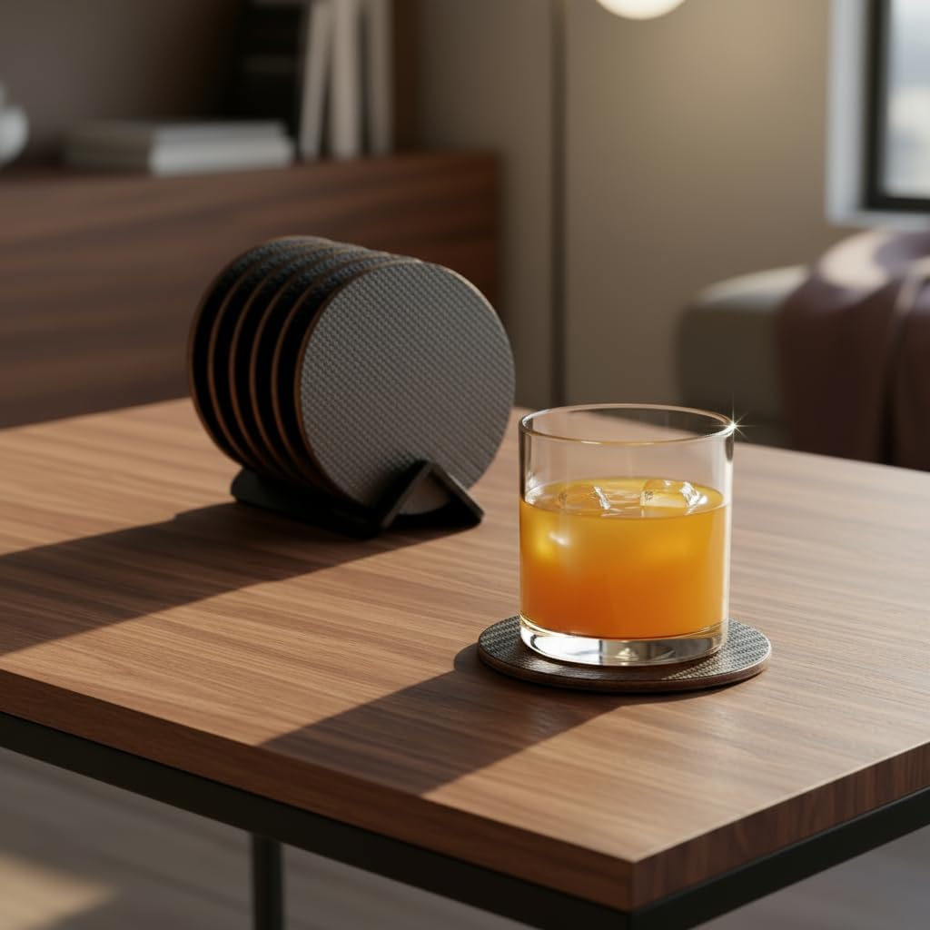 SIZE: 4 x 4" Round Shape COLOR: Dark Gray Carbon Structure WHAT’S INCLUDED: Set of 6 Carbon Coasters and 1 Acrylic Coaster Holder WHY CHOOSE PRESTONE PRESTIGE COASTERS? HIGHEST QUALITY CARBON FABRIC ON PLYWOOD CORE Constructed with premium materials for maximum durability, these coasters feature a 0.16" thick plywood core with a soft carbon surface, HD texture, and an exquisite finish that enhances any décor. The waterproof carbon surface prevents absorption of water drops, ensuring your table remains clean and dry. BEAUTIFUL MINIMAL DESIGN Housed in an eco-friendly gift box, the set includes a sleek acrylic coaster holder and elegantly laser-cut round-shaped coasters. They protect your furniture from stains and scratches while adding a touch of modern sophistication to your space. UNIVERSAL SIZE Designed with a 4" diameter, these coasters are ideal for all cups, mugs, and glasses. Perfect for use at home, in the office, at parties, or in bars, combining practicality with style. AMAZING VALUE Enjoy top-notch quality (non-Chinese manufacturing) at an unbeatable price. This set offers exceptional value and superior craftsmanship you won’t find elsewhere. SATISFACTION GUARANTEED Don’t wait to elevate your decor and protect your furniture. Click ‘Add to Cart’ now and experience the simple, modern elegance of PRESTONE PRESTIGE