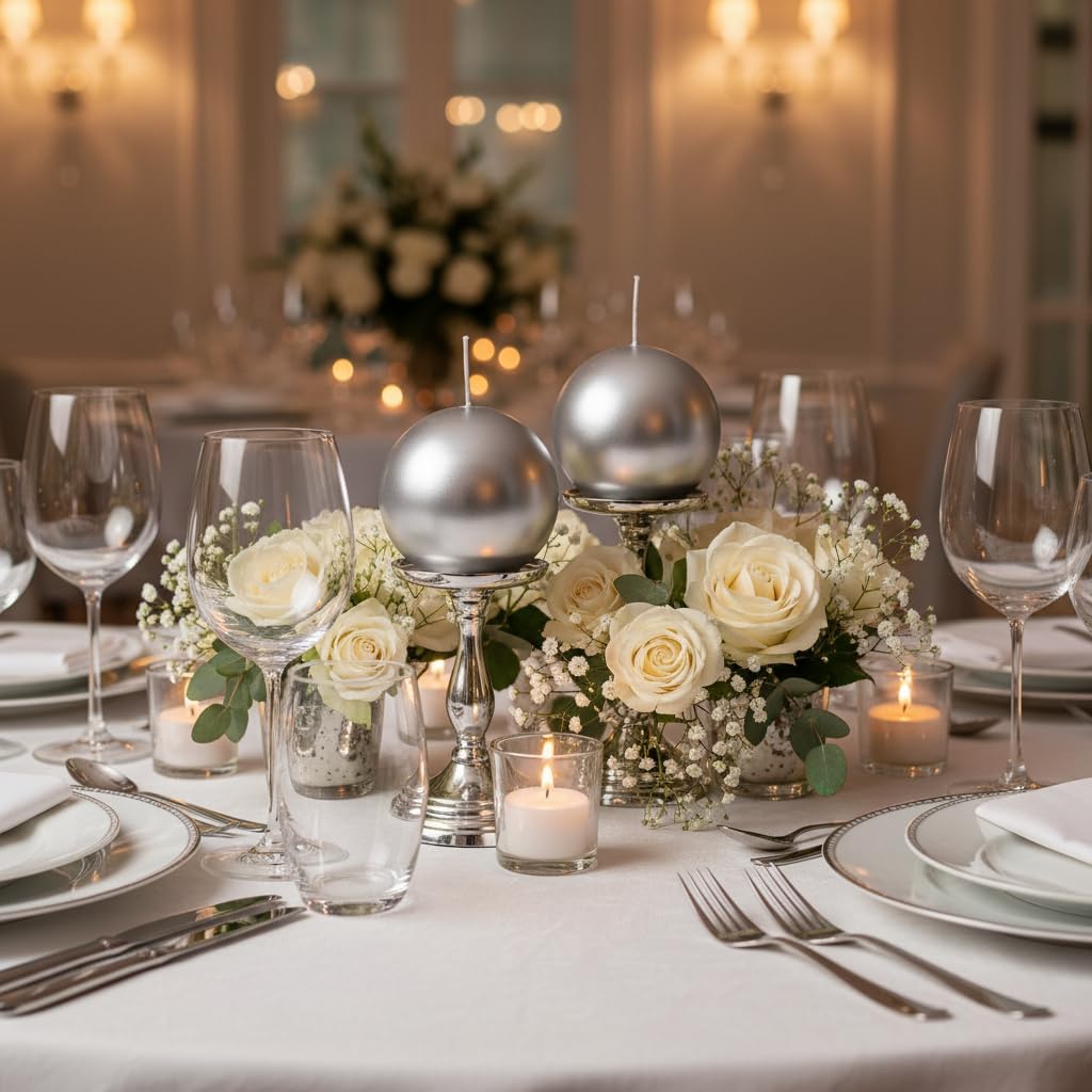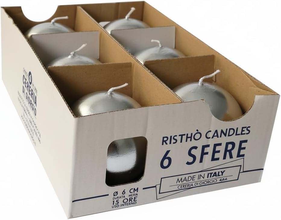 Pack of 6 pieces of silver ball candles of diameter 6 cm. risthò is the line of candles of George designed for restaurants, hotels, catering and bar. Torches, candles, elegant tea: A comprehensive set of shapes and colours, a complement almost indispensable for creating intimate atmospheres or vitality.