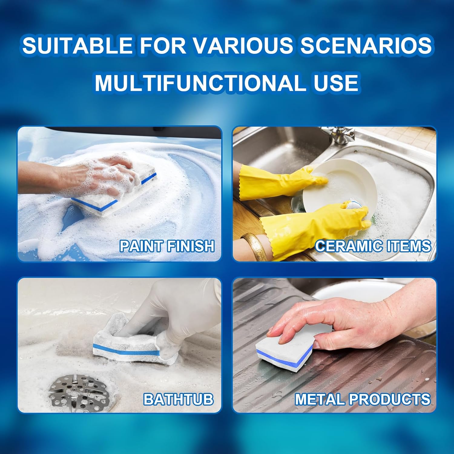 100 Pack Upgraded Magic Eraser SpongeSpecificationMaterial: spongeColor: White & BlueDimensions: 10 x 6 x 2.5 cm / 3.93 x 2.36 x 0.98 inchesQuantity: 100pcsFeatureHome cleaning assistants clean boat accessories: used to clean walls, baseboards, showers and bathtubs in houses; boat accessories can also remove coffee and tea stains on glass water cups. Marine cleaning sponges can also be applied to gel coat, metal, plastic and painted surfaces.If you know the damage that strong chemicals can cause to your family, then you will like the fact that these eraser sponges do not need any chemicals. Just add water to easily solve the most difficult stains.These high-quality erasers can cut through everything, from soap scum in the bathroom to the stubborn oven grease in the kitchen. They can even easily remove crayons and other stains from the wall.Magic sponge can effectively remove footprints, grease marks, fishing debris, fishing tackle box and cooler marks, fishing rod and net cover stains; marine eraser is easy to remove dirt, dirt, grease, mud, etc. on the ship deck, console and seat, Scum and dirt.Trusted by professional cleaning staff-whether you are an occasional trademark or a large cleaning company, you will enjoy the amazing value of our eraser products.