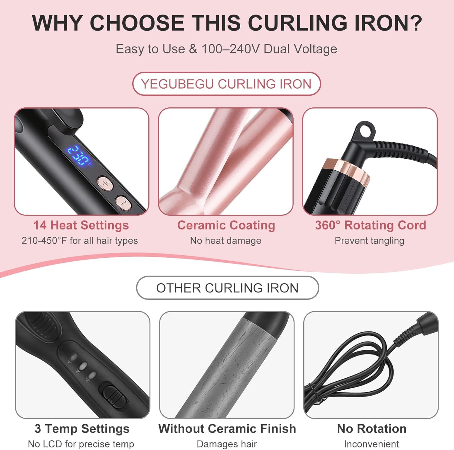 YEGUBEGU Professional Long Barrel Hair CurlerProduct Model: YEGUBEGU C38 ProBenefit: Easy to achieve an elegant and charming appearance. How to use this 38mm curling irons?step 1: Turn it on by holding down the ON/OFF button. Then, set the suitable temperature for your hair type and wait 30 seconds. step 2: Put on the heat-resistant glove. Start styling by wrapping a section of your hair around the barrel.step 3: Wrap your hair around the wand and hold it there for 8 to 12 seconds. Then, release and repeat until finished.WE ARE ALWAYS AT YOUR SERVICE!24 Hours Support2 Year Warranty