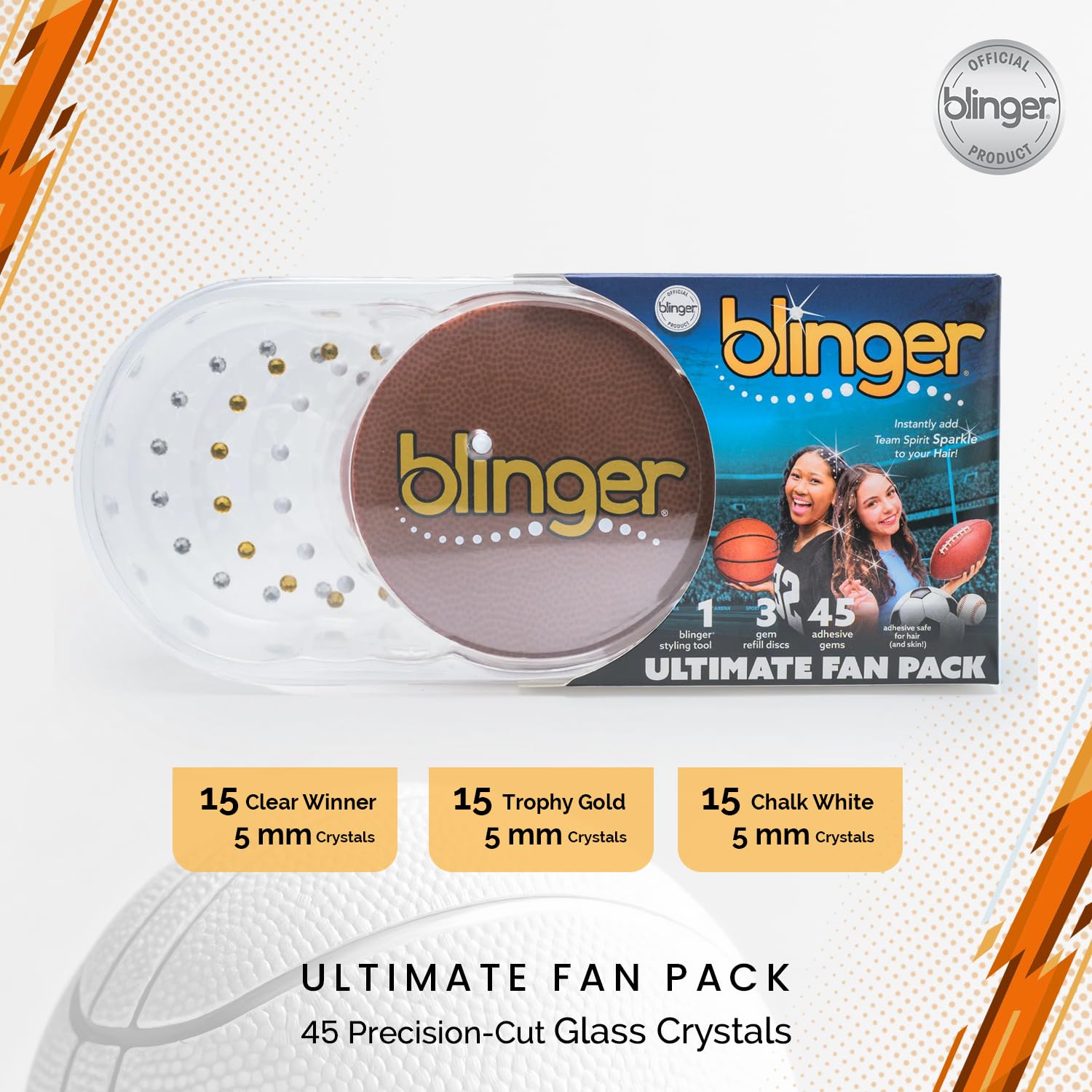 • WHAT’S INCLUDED : Includes a sporty “leathered” blinger tool and 45 precision-cut crystals: 15 Clear Winner, 15 Trophy Gold, and 15 Chalk White (5mm each). Three vibrant colors that mix seamlessly with team gear. Additional colors sold separately.