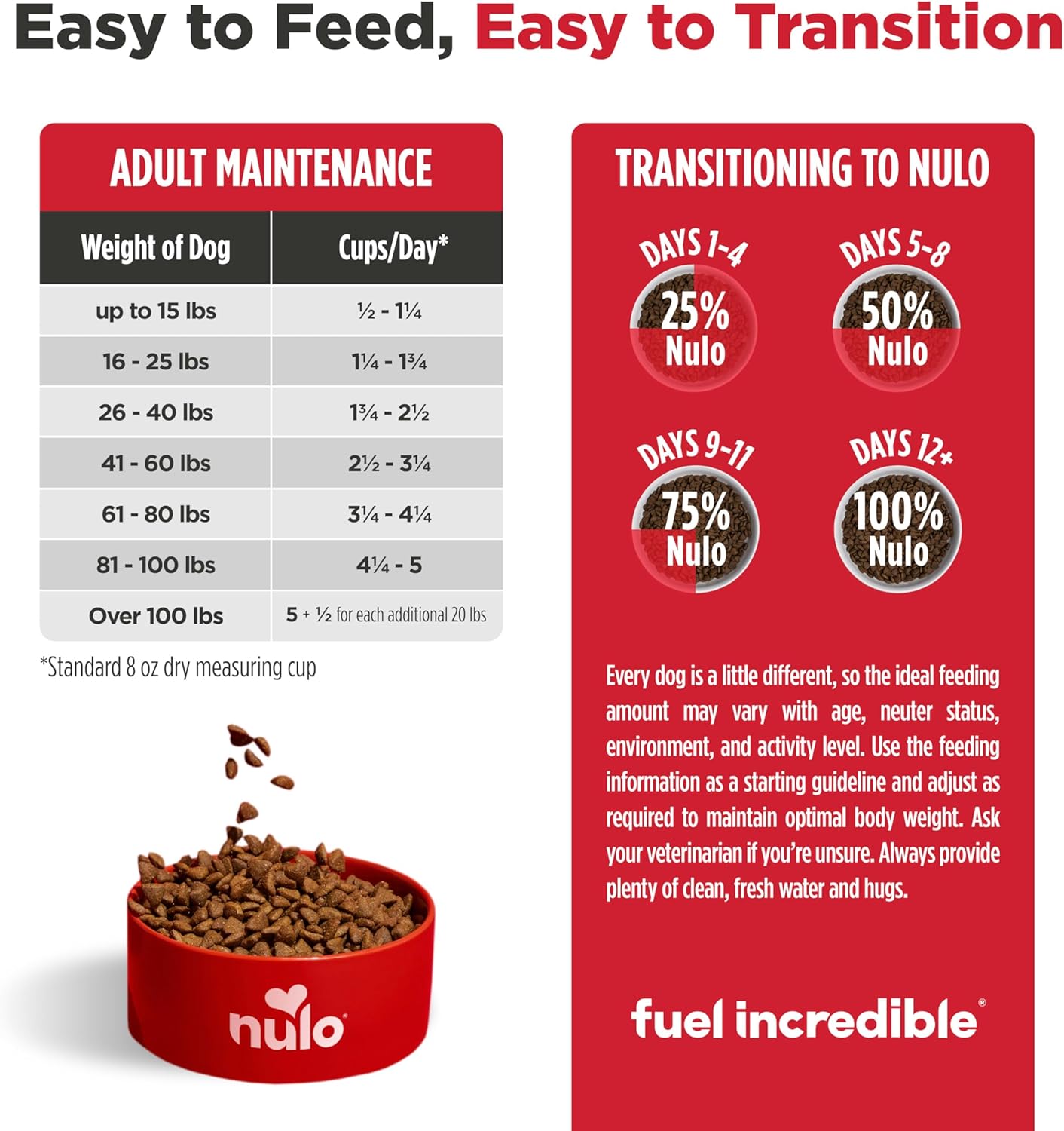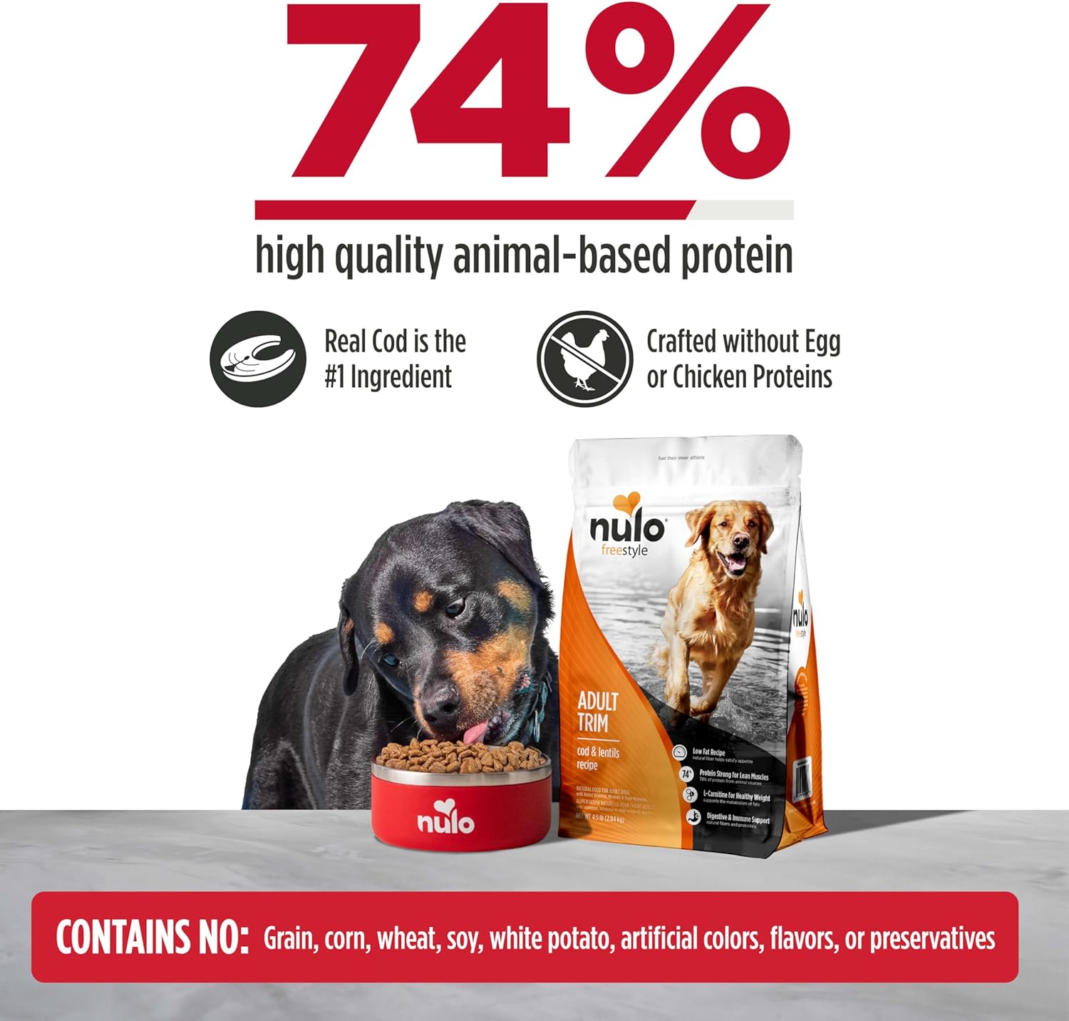 Fuel Incredible with Nulo FreeStyle Dog Food - Adult Trim Cod & Lentils Grain Free Dry Dog Food, 26 lb Bag Natural pet food for weight management for adult small, medium, and large dog breeds. Staying fit and trim can be more challenging for some dogs, which is why we created Nulo FreeStyle Adult Trim. A premium, lower-fat, grain-free recipe that delivers the high-quality protein dogs need with more fiber and fewer calories from fat. With 74% protein from animal sources, real deboned cod leads this nutrient-dense recipe to help maintain lean muscle while supporting steady energy and a healthy body condition. L-Carnitine aids fat metabolism, while natural fiber from lentils, chickpeas, and sweet potatoes keeps appetites satisfied between meals. Advanced BC30 probiotics and prebiotic fiber promote digestive health, nutrient absorption, and overall wellbeing, helping your dog look and feel great from the inside out. Taurine and methionine contribute to heart health and stamina, completing a carefully balanced formula crafted for long-term performance and everyday wellness. What’s left out matters too. No chicken proteins, eggs, grain, corn, wheat, soy, white potatoes, rice, or tapioca, and never any artificial colors or preservatives. Only clean, purposeful ingredients selected by expert animal nutritionists. Dogs don’t just eat Nulo kibble, they love it. Every delicious recipe is taste-tested to win over even picky eaters, so bowls are licked clean at every mealtime! Nulo dog food is pet nutrition with intent, inspired by the same standards athletes demand for themselves: high protein, low carbs and low glycemic index. Thousands of pet parents report seeing the difference: leaner bodies, shinier coats, and happy tail wags. With Nulo dry dog food, you’re not simply filling a bowl, you’re fueling your pet’s health, happiness, and lifetime of incredible moments together.