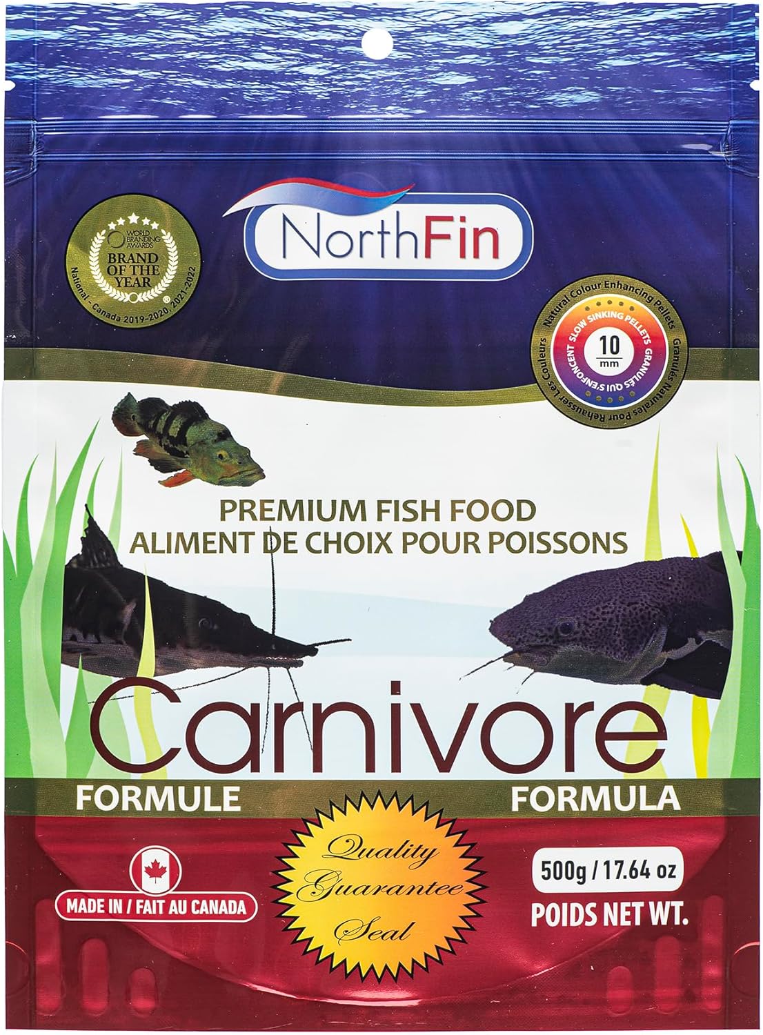 NorthFin Mass Carnivore Formula is professionally developed to improve the health and well-being of your large predatory fish, while naturally enhancing their brilliant colors. Ideal for carnivorous species that require a higher protein content in their diet. Made exclusively with premium quality ingredients, this balanced and nutritious daily diet is completely free of fillers, hormones, and artificial pigments. Easily digestible, slow-sinking 10 mm pellets promote optimal nutrient absorption and help reduce the amount of waste in your aquarium. Proudly made in Canada. All NorthFin premium fish foods are made with the following key ingredients:Antarctic Krill - Krill contains high quality protein, amino acids, vitamins, and minerals. It is also a natural source of carotenoids, which bring out the rich and vibrant colors of your fish. Contains a high concentration of Astaxanthin which is a powerful natural pigment and antioxidant.High Omega-3 Herring Meal - The highest grade fish meal, Herring Meal contains a higher concentration of DHA which promotes healthy development, growth, and coloration in fish. Freshly caught and frozen.Certified Organic Kelp - A type of marine seaweed, Kelp supplies approximately 60 minerals, 21 amino acids, and 12 vitamins. It also provides nitrogen, potassium, and micro-nutrients. Improves the overall health and activity of your fish.Spirulina - This 100% natural blue-green algae is packed with raw proteins and a wide range of vitamins and minerals to promote optimal health and improve immune function. It also contains beta-carotene and other natural pigments for color enhancement.Calcium Montmorillonite Clay - Contains 67 minerals including calcium, iron, magnesium, manganese, potassium, silica, and more. Also provides essential trace elements. Helps compensate for previous dietary deficiencies.