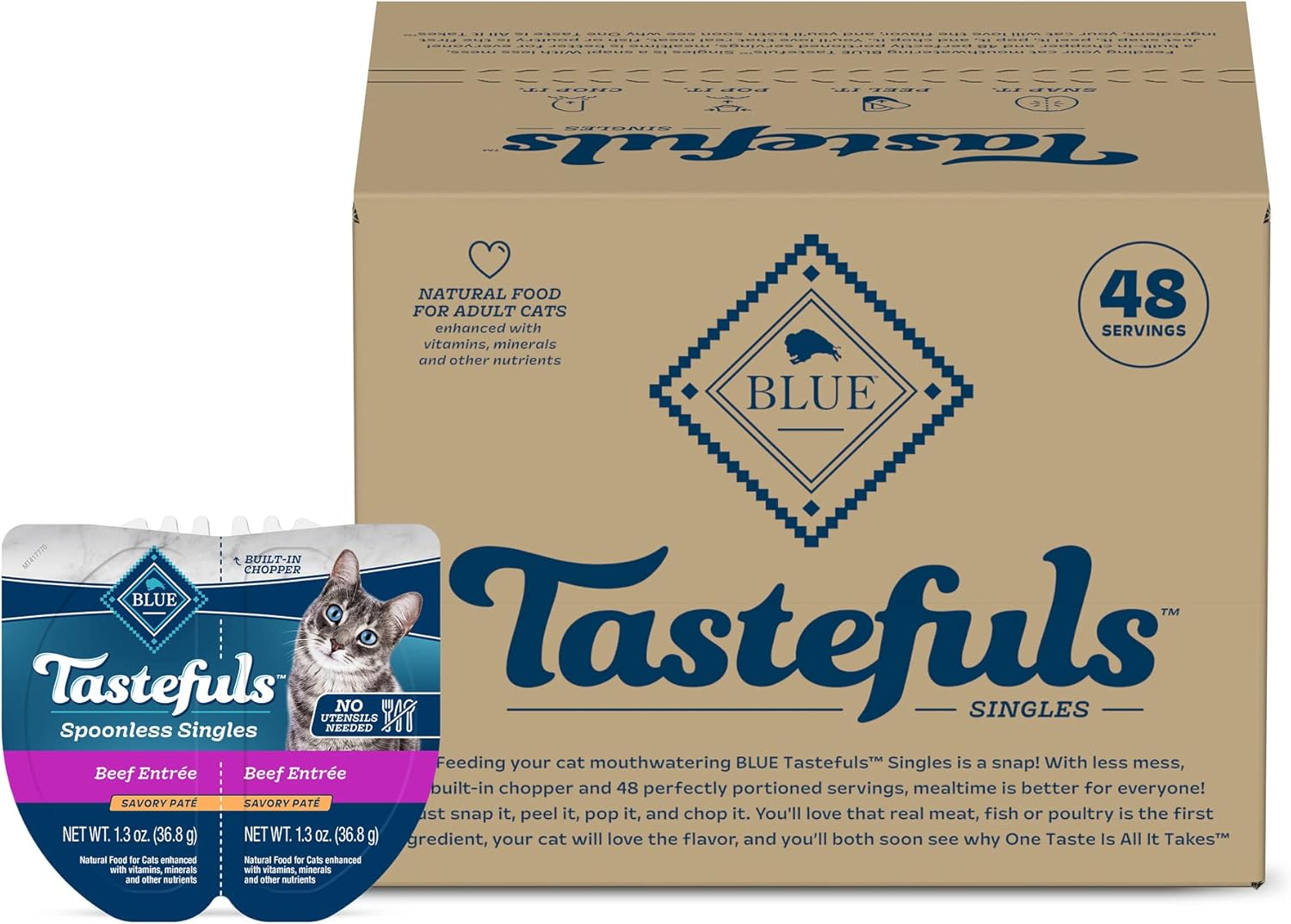 BLUE Tastefuls Natural Wet Cat Food Trays are deliciously healthy, high-moisture cat food servings formulated with real chicken or turkey as the #1 ingredient. Blue Buffalo cat food is a great choice for Pet Parents who want to prioritize natural ingredients loaded with flavor for discerning palates. This cat food is formulated without any chicken (or poultry) by-product meals. It's also free of corn, wheat, soy, and artificial flavors and preservatives. This wet cat food multipack ensures your best friend can enjoy a variety of savory and healthy entrées. One taste of Blue Buffalo wet cat food is all it takes to keep your cat purring for more.