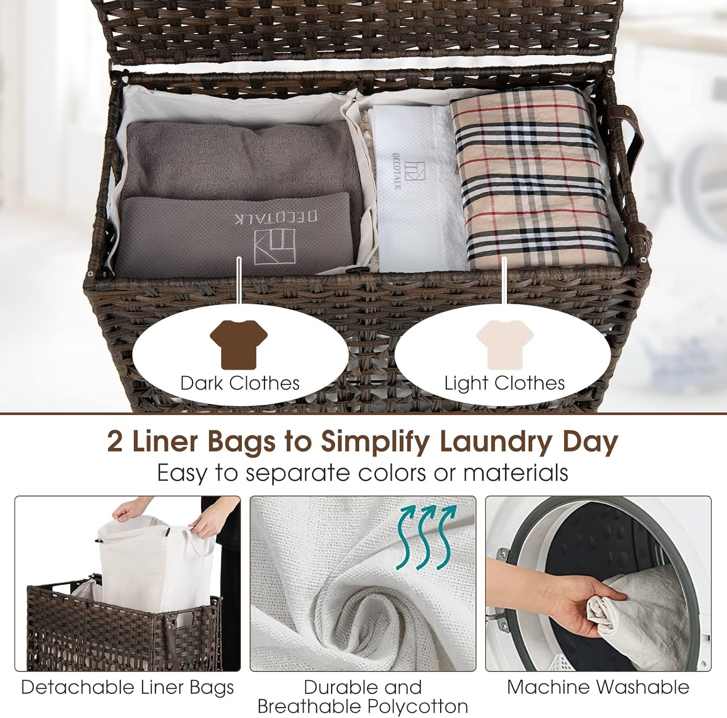 Description:Our laundry hamper is a good helper to organize your dirty clothes. With the large storage capacity of 110L, you will no longer be bothered about messy room. Moreover, 2 removable and machine washable liner bags are made of soft polycotton fabric and fixed with buckles, which enables you to sort clothes of different colors and materials. The combination of waterproof PE rattan and solid steel frame ensures a rugged and durable structure. Considering convenient use, the laundry hamper comes with recessed handles and PU strap for easy transportation. In addition, there are 4 smooth rolling wheels(2 of them are lockable) at the bottom for free movement. All in all, this synthetic rattan clothes hamper is a perfect piece for laundry room, bathroom, and bedroom. When not in use, it can be folded into a compact size for easy storage.Features:The laundry hamper can hold up to large capacity of 110L2 removable and machine washable liner bags for easy cleaning2-section design is perfect for separating clothes of different colorsExquisite handwoven PE rattan features waterproof and durabilityHeavy-duty steel frame accounts for high reliable structure4 smooth rolling wheels(2 of them are lockable) for free movementRecessed handles and PU strap for easy access and transportationFoldable design for convenient storage and saving spaceEasy to assemble under the guidance of instructionSuitable for laundry room, bedroom, living room and bathroomSpecifications:Color: BrownMaterial: Steel, PE Rattan, Polycotton, PUOverall Dimension: 25.5" x 13" x 26.5" (L x W x H)Interior Dimension: 25" x 12" x 22.5" (L x W x H)Size of Each Liner Bag: 12" x 12" x 21.5" (L x W x H)Height Above The Floor: 3.5" (H)Overall Capacity: 110LNet Weight: 9lbsPackage Includes:1 x Laundry Hamper2 x Liner Bag