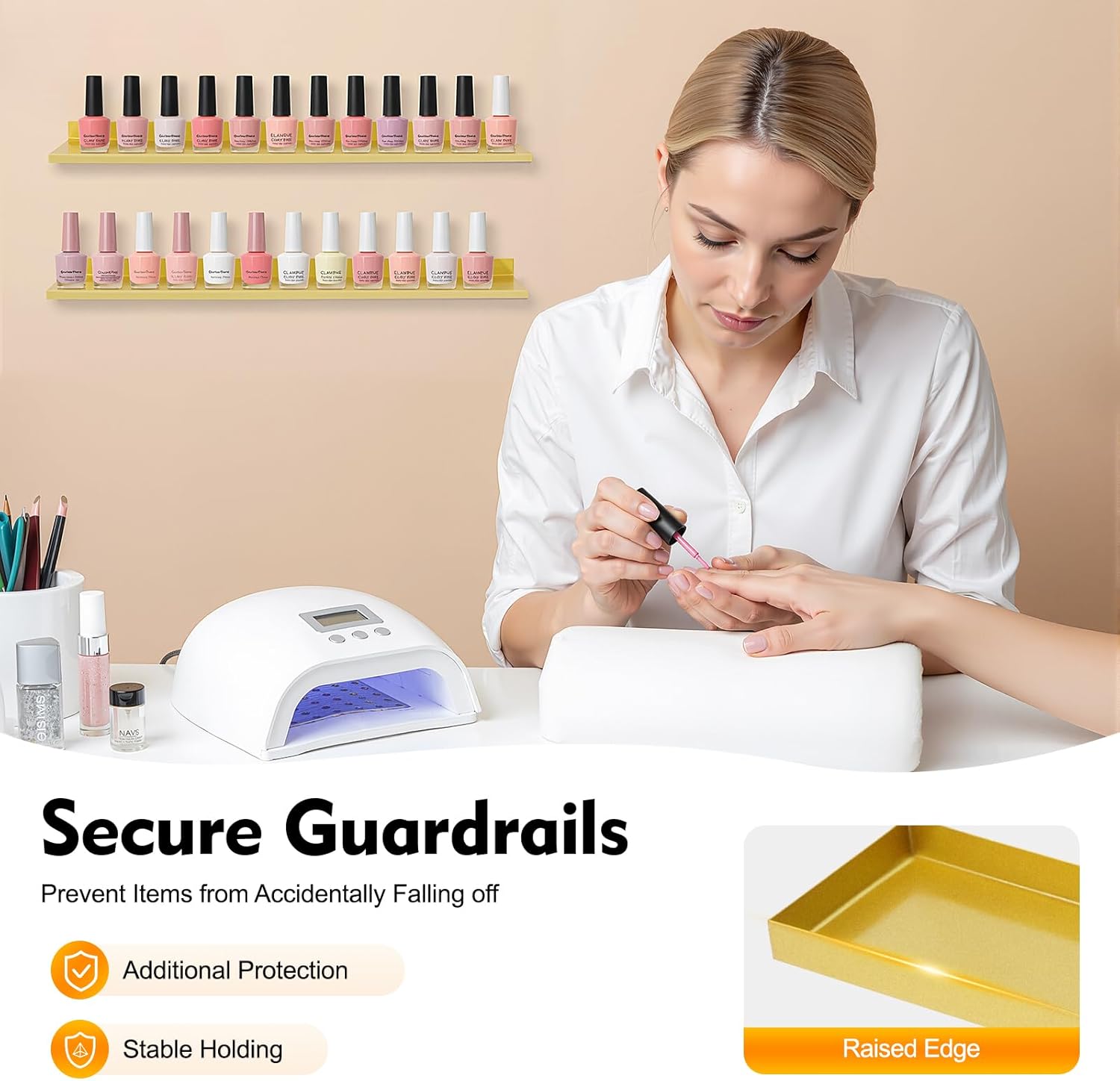 SpecificationColor: GoldStyle: ModernShape: TriangleMaterial: IronProcess: High-Temperature Paint Baking, WeldingMount Type: Wall-mountedInstallation Required: YesNumber of Pieces: 10Number of Tiers(Each Triangular Rack): 5Each Triangular Rack Maximum Load-bearing Capacity: About 10kg/22.05lbsEach Horizontal Bar Maximum Load-bearing Capacity: 3kg/6.61lbsTier Spacing: 13cm/5.12inEach Triangular Rack Size: 66*70*7cm/25.98*27.56*2.76inEach Horizontal Bar Size: 55*8cm/21.65*3.15inTotal Installation Length: 2.4m/7.87ftPackage Size: 68*77*12cm/26.77*30.31*4.72inGross Weight: 11kg/24.25lbsNet Weight: 10kg/22.05lbsPackage Included5* Triangular Racks5* Horizontal BarsOther Accessories for InstallationNotes1.Please note that this product does not include other items such as nail polish.2.Please avoid exposing the product to acidic or alkaline substances during use.3.Please allow the slight color difference caused by the shooting light and 1-3cm error due to manual measurement, and make sure you do not mind before ordering.