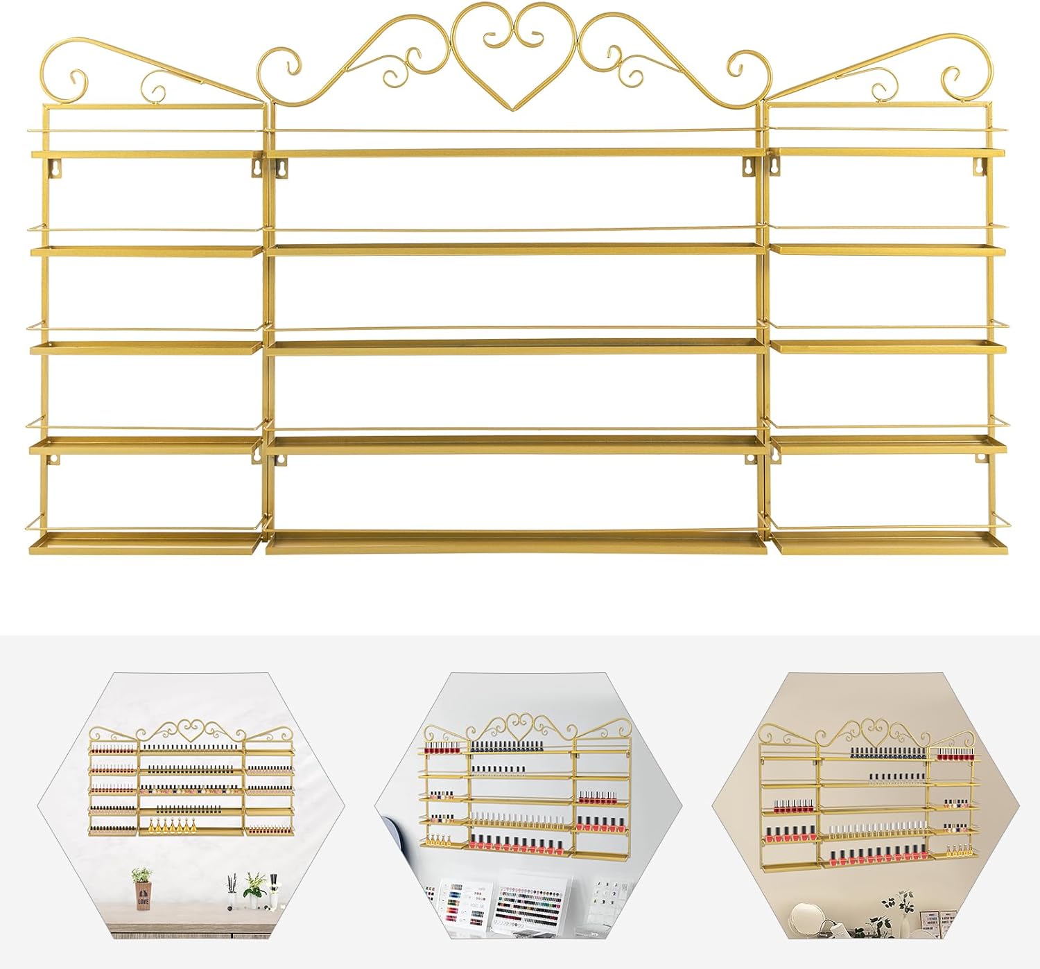 DetailsFences and Baffles: They can effectively prevent items from falling and ensure safe use.Smooth Edge: The rounded and smooth edges not only add to the aesthetics of the product but also improve the safety of use.Hanging Holes: They make it easy for you to hang the shelves stably on the hooks on the wall.ApplicationThis product is suitable for use in homes, nail salons, spas, stores, etc. It can be used to place a variety of items, such as cosmetic bottles, perfumes, lipsticks, vases, eyeglasses, and photo frames.SpecificationColor: Gold/White/BlackStyle: ModernShape: RectangleMaterial: IronProcess: Baking PaintAssembly Required: YesMounting Type: Wall-mountedNumber of Pieces: 3Number of Tiers: 5Middle Rack Size: 65*6.5*71 cm/ 25.59*2.56*27.95 inEach Side Rack Height: 67 cm/ 26.38 inGross Weight: 4.8kg/ 10.58 lbs Net Weight: 4kg/ 8.82 lbsPackage Size: 73*67*9 cm/ 28.74*26.38*3.54inPackage Included1* Middle Rack2* Side RacksAll Accessories for InstallationNotes1. Please use wipes or chicken feather duster(not included) to clean.2. Please do not contact with acids, alkali and corrosive liquids.3. Please allow the slight color difference caused by the shooting light and the 1-3 cm error due to manual measurement, and make sure you do not mind before ordering.