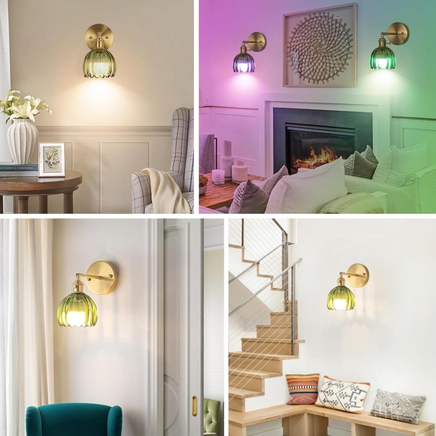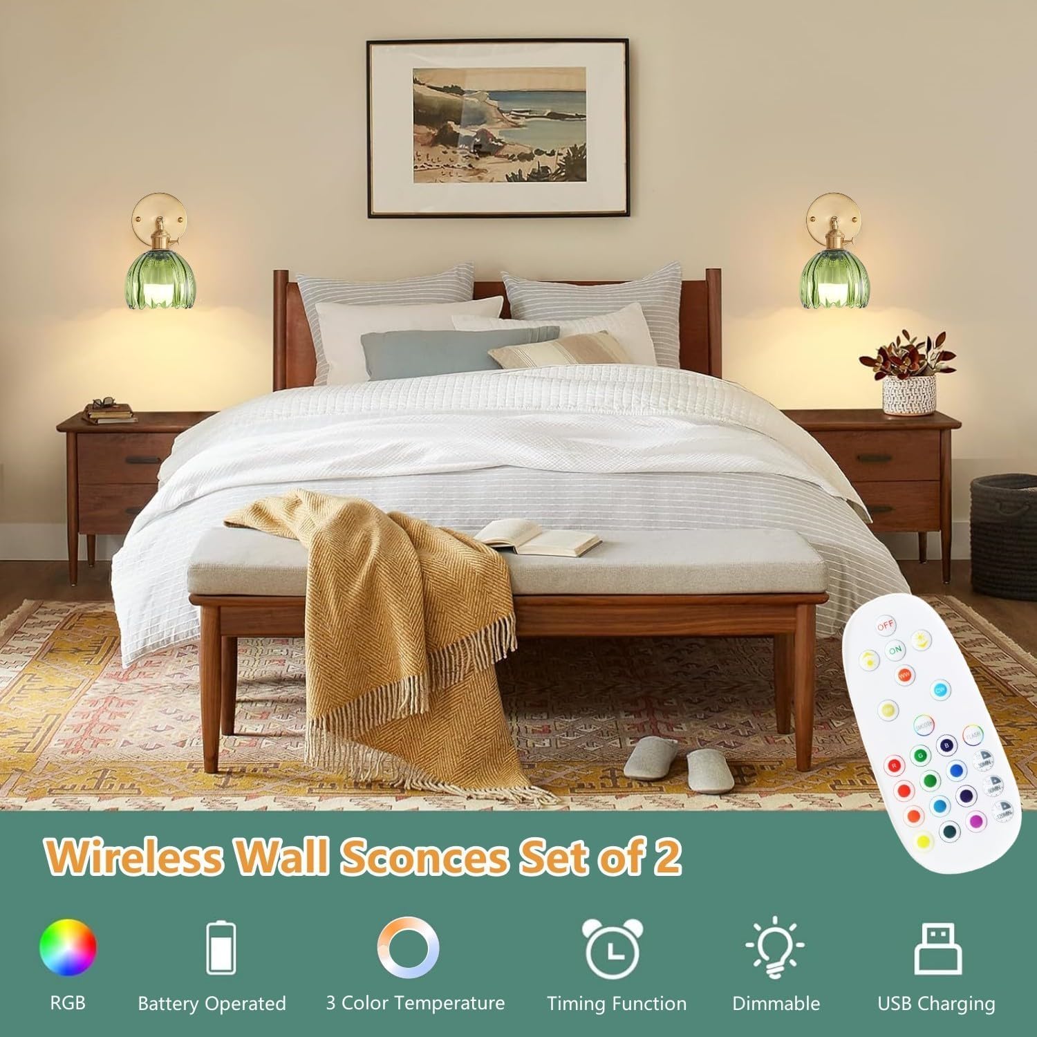 ❤ Specification of Wall Light Color: Green & Gold Material: Glass & Metal Installation: Wireless Style: Farmhouse, Vintage, Modern Bulb Socket: E26 Base ❤ Package Information 2 x Green Glass Wall Lights 2 x Battery Operated Bulbs 2 x Remote Control 2 x Accessory Kit 1 x User Manual ❤ Battery Operated Wall Sconces Set of 2 This product is battery powered and bulbs can be charged via USB cable, no need to buy extra batteries ❤ Wide Application This modern indoor wall sconce lighting is suitable for bathroom, bedroom, dining room, living room, kitchen, foyer, balcony, hallway, stair etc. ❤ Customer Questions & Answers 1. Question: Can it dim? Answer: The battery-powered wall light can adjust the color temperature, 3-color dimming 3000K/4000K/6000K. 2. Questions: Can it adjust the brightness? Answer: The modern wall mount lamp can adjust the brightness, from 0 to 100%. 3. Question: Will it remember the brightness and color temperature I used last time? Answer: Yes, it can. The bulb has a memory function.