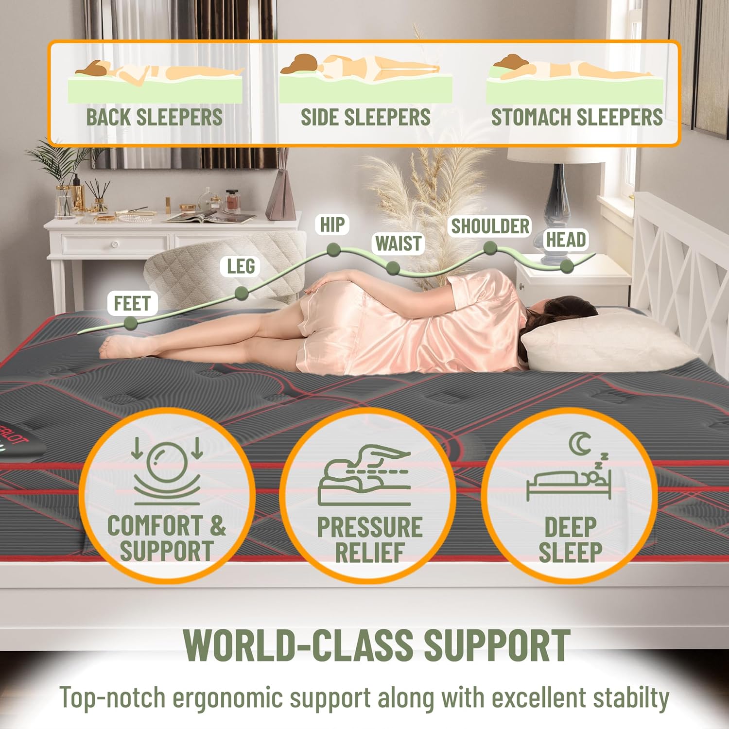 Our Ottopedic Mattresses combine high quality materials in traditional stores with onlineshopping advantages like convenience and costeffectiveness. A good night's sleep is key to wake up fresh and relaxed. Durably engineered with comfort in mind, this mattress will provide you the dream sleep and best rest. With just the right amount of support and cushioning, this mattress relieves pain and stress in pressure points, on your head, neck, hips, lower back and spine while eliminating motion transfer thanks to sumptuous layers. And it is perfect for your individual body shape. Quilted with highquality breathable fabric which is strong, light, and soft, this mattress allows ample airflow and regulates temperature keeping the sleep surface cool and comfortable.