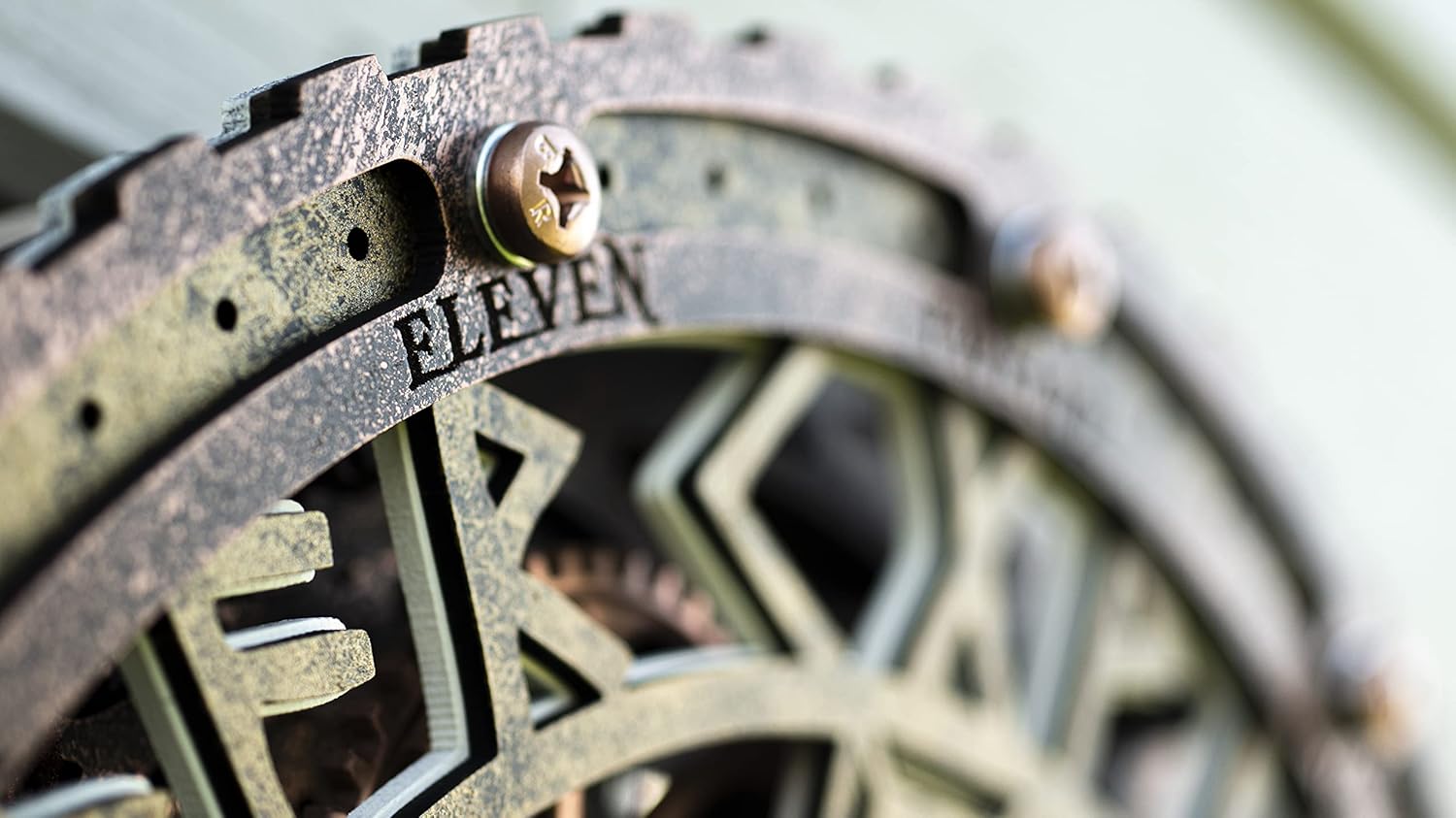 This big wall clock Automaton Bite 1682 Mjölnir is made of several layers of wood, woodstained and painted high quality acrylic paint and a piece of acrylic mirror. The front elements of the clock are decorated with detailed and intricate engraving. Stainless steel elements and copper coated screws are used in the construction of this clock model. While making the design of a new clock we were inspired by Mjölnir which is in Norse mythology the hammer of Thor, the Norse god associated with thunder. Mjölnir is depicted in Norse mythology as one of the most fearsome and powerful weapons in existence, capable of leveling mountains. The Prose Edda relates how the hammer's characteristically short handle was due to a mistake during its manufacture. The hands motion is complemented by the movement of 4 gears each of which is an AA battery operated. The mirror on the background adds some volume to the clock and amplifies the movement effect, transforming the clock into a kinetic installation. Upon request the clock can be personalized with a text engraving, which will neatly supplement the look of the clock face. Clock size 36x36 cm / 14x13 in *AA batteries are not included **the clock hands can slightly differ from those you see on the pictures