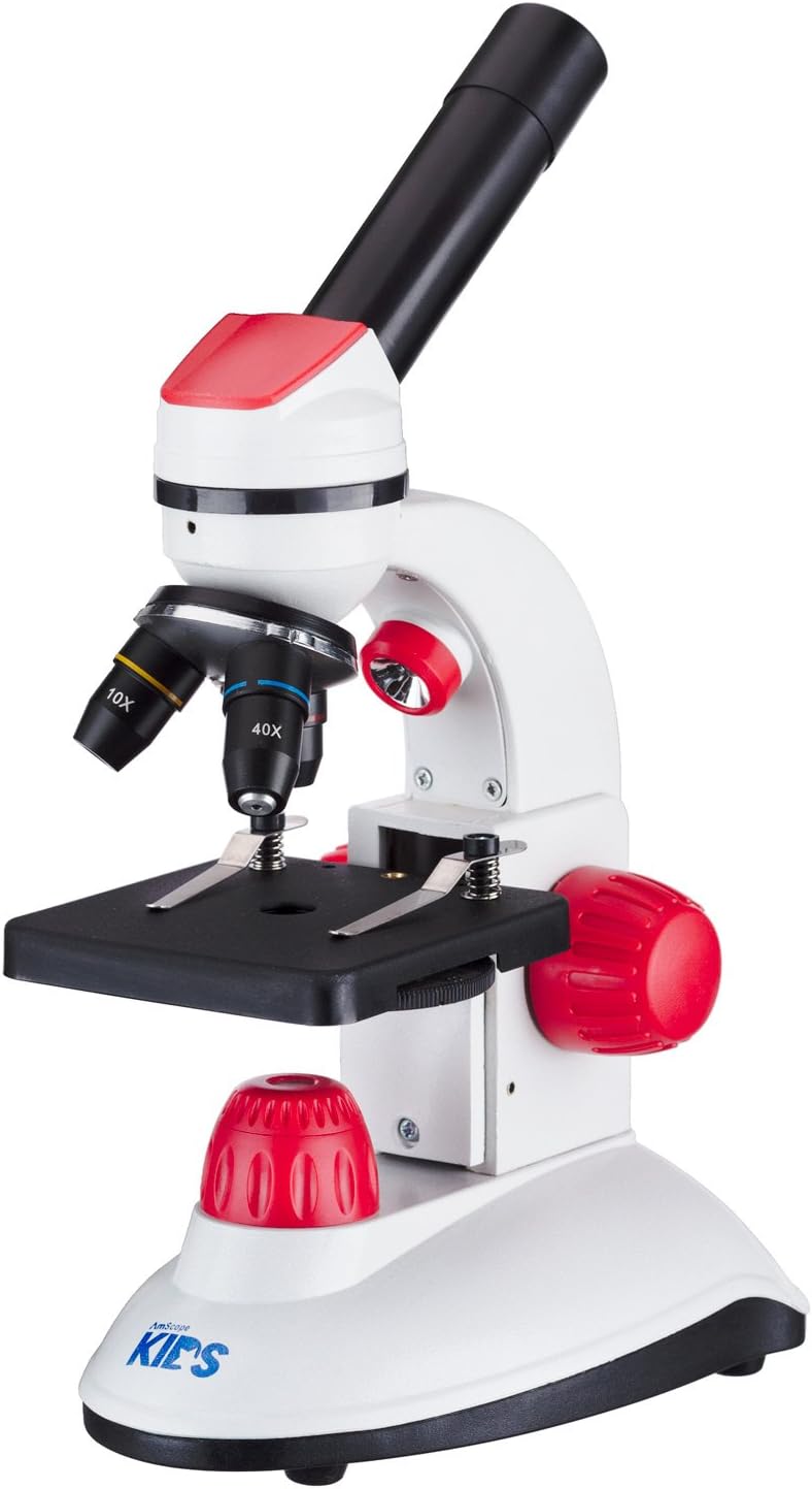 This is a terrific beginner microscope for kids and young adults. With 3 objective lenses, and 2 eyepieces, you can use 5 magnification levels from 40X to 1000X. The magnification range is ideal for viewing microscopic organisms, like what you might find in water samples from a lake or ocean. It's also great for looking at crystal structures and metallurgical samples. The top and bottom LED illumination provide light for both translucent and opaque objects. This means you can look at ultra-thin tissue samples, or plant leaves and insects. And since the microscope is battery-powered, you can take it anywhere. The easy-to-use controls guarantee that anyone can get the hang of using the microscope in no time. The 3-lens turret can switch between the 4X, 10X, and 40X objective lenses by simply rotating. The specimen-stage has two clips to hold a slide or other object in place, while focus is adjusted by turning the large knob on either side of the microscope. A switch on the back will select the top light for opaque objects, or bottom light for translucent ones. An aperture wheel under the stage can be rotated to change the focus of the bottom light, which can increase or decrease the detail in the specimen. This kit includes 5 prepared slides, as well as a collection of tools for making your own slides. There's a Petri dish for holding liquid samples, and 5 blank slides and cover slips for mounting thin-section specimens, like tissues. There's an easy-to-use microtome for slicing specimens, and red and blue stains to improve contrast in highly-translucent specimens. A vial, stirring rod, and pipette will help prepare wet-mount slides. And, of course, there are tweezers to help with the more-delicate subjects. To make things even better, we've included the book "The World of the Microscope" as an introduction to microscopy. Product Features: Easy to use, and great for kids 40X to 1000X magnification range with two eyepieces High-grade glass optics for sharp, clear image Transmitted and reflected lighting for translucent and opaque objects Includes prepared slides Includes blanks slides and tools for preparing your own specimens Includes a Fantastic Book About Microscopes Contents: One M50 microscope with 3 objective lenses and 10X eyepiece One 25X eyepiece One Bottle of Eosin One Bottle of Methylene Blue One Tweezers One Swab Five Blank Slides + Cover Slips Five Prepared Slides One Set of ID Stickers One Petri Dish One Pick One Stirring Rod One Vial One Set of Kimwipes One Pipette One Microtome 1 book: The World of the Microscope