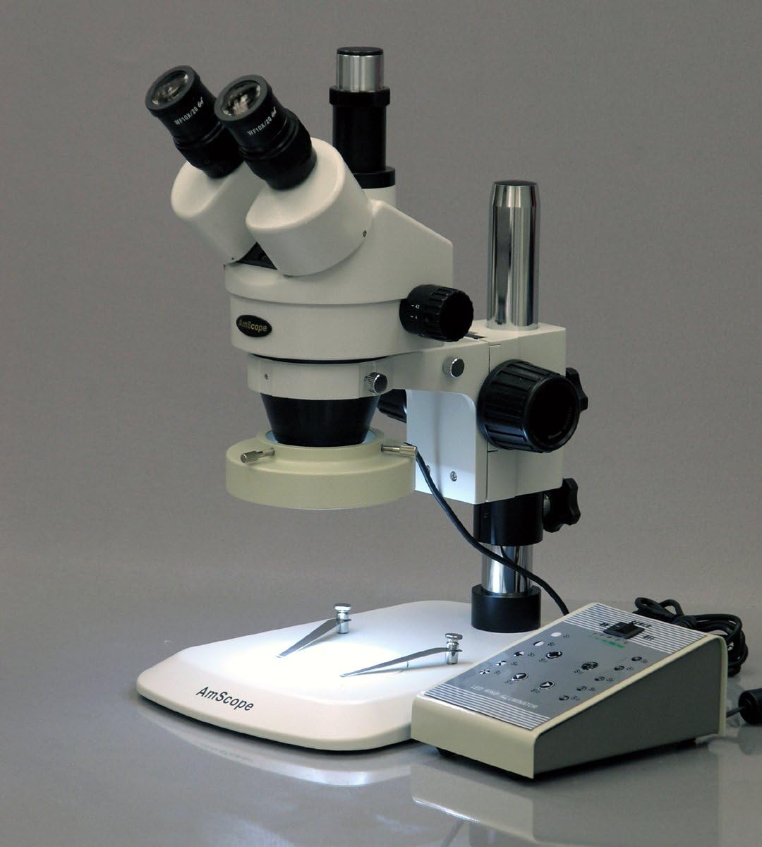 The AmScope SM-1TNZ-80AM-5M digital professional stereo zoom microscope has a pair of 10x super-widefield high-eyepoint eyepieces, a 0.7x-4.5x zoom objective, two Barlow lenses, and a pillar stand. The microscope has an overall magnification range of 3.5x-90x. The 5MP camera has a CMOS color sensor, a reduction lens, image capture and editing software, and USB 2.0 output to capture or display still or video images on a computer or projector. The trinocular viewing head has an interpupillary range of 55 to 75mm, a 45-degree inclination to reduce eye and neck strain, and 360-degree rotation to enable sharing. The vertical trinocular port can be used as a C-Mount or 23mm photo port. The WH10x20mm super-widefield high-eyepoint eyepieces combine with the 0.7x-4.5x zoom objective to provide zoom magnification and a longer working distance for inspecting large-scale specimens that require handling or repair. The microscope comes with 0.5x and 2.0x Barlow lenses that can be added to the objective to increase the magnification range. A Barlow lens with a magnification of less than 1.0 reduces magnification and increases the working distance, while a Barlow lens with a magnification greater than 1.0 increases the magnification and reduces the working distance. High-eyepoint eyepieces ease viewing for users who wear glasses, and dioptric adjustment accommodates individual eye-strength differences. A digital stereo microscope, sometimes called an inspection or dissection microscope, has low magnification and a long working distance that enables users to manipulate the object being inspected, and is used where image capture, detailed records, or documentation is required.The 5MP digital camera has a CMOS color sensor for displaying still microscopy images and streaming live videos to a computer or projector. The camera has 40x magnification and a 0.5x reduction lens that ensures that the display has a similar field of view as the microscope eyepiece. The camera can be mounted in a C-Mount or any 23mm eye tube. The camera includes image capture and editing software that provides still image and live video capture and editing capability, including measurement functions. The software supports JPG, TIF, GIF, PSD, WMF, and BMP file formats and is compatible with Windows XP, Vista, 7, and 8; Mac OS X; and Linux. Camera drivers are compatible with Windows XP, Vista, 7, and 8; Mac OS X; and Linux. The software includes Windows APIs for native C/C++, C#, DirectShow, Twain, and LabVIEW that enable custom application development. The camera has a USB 2.0 data port (cable included).The removable 80-bulb LED ring light has eight separate zones to independently control light intensity and direction, and five programmable memories to remember settings for quick access across tasks. The ring light provides bright, cool light for working with temperature-sensitive or live specimens, and shadow-free illumination. A rheostat controls the amount of light emanating from the lamp. Power and adjustment controls are located on a control box to speed adjustments. The ring has a 2-5/8" (66mm) inside diameter and a 4-3/8" (110mm) outside diameter. The light has an optimum working range of 2-3/8 to 5-1/2" (60 to 140mm). It has a 100,000-hour life span and a 110V-240V variable power supply. The microscope has a pillar-style table stand. It has a 3-3/4" (95mm) diameter reversible black and white stage plate to provide contrast with light- and dark-colored specimens, and large stage clips to secure the specimen during viewing. The solid cast-steel base is 0.75 x 10 x 12.5 inches/20 x 280 x 320mm (H x W x D, where H is height, the vertical distance from the lowest to highest point; W is width, the horizontal distance from left to right; D is depth, the horizontal distance from front to back).Microscope SpecificationsHeadTrinocularMagnification range3.5x-90xZoom objective power0.7x-4.5xEyepieces (DIN, 30mm)WH10x20mm high-eyepointTrinocular portC-Mount or 23mmField of view range2-1/2"Optical working distanceUp to 8"Microscope standPillarHead movementX-axisIllumination typeEpiscopic (reflected)Light sourceEight-Zone LED ring lightPower110V-240VCamera SpecificationsResolution5MP (2592 x 1944 effective pixels)Image typeStill image and video display and captureCamera typeBrightfieldCamera sensor1/2.5" Aptina MT9P001 CMOS (color)Magnification40xReduction lens0.5xMounting size23mm or C-MountFrame rate60fps at 640x480; 18fps at 1280x960; 5fps at 2592x1944Computer connectionUSB 2.0 (backward compatible on PCs only)File formatsJPG, TIF, GIF, PSD, WMF, BMPSoftware packageImage capture and editing for Windows XP, Vista, 7, and 8; Mac OS X; and LinuxCamera driver compatibilityWindows XP, Vista, 7, and 8; Mac OS X; and LinuxMicroscopes are instruments used to enhance the resolution of an object or image. Types include compound, stereo, or digital. Compound microscopes use a compound optical system with an objective lens and an eyepiece. Stereo microscopes show object depth in a three-dimensional image. Digital microscopes are used to display an image on a monitor, rather than looking through a lens. Microscopes can have monocular (one), binocular (two), or trinocular (three) eyepieces, with varying magnification abilities. Magnification ability refers to the size of an image. Resolution, also known as resolvant power, refers to the clarity of the image. The interaction between field of view (FOV), numerical aperture (NA), and working distance (WD) determines resolution. Microscopes can control magnification through a fixed focus, or through a range of adjustments. They can also utilize LED, fluorescent, and mirror light sources to help control viewing capabilities. Microscopes are widely used in education, lab research, biology, metallurgy, engineering, chemistry, manufacturing, and in the medical, forensic science, and veterinary industries.United Scope manufactures microscopy equipment and accessories under the brand name AmScope. The company, 