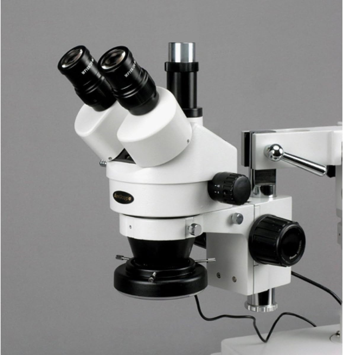 The AmScope SM-4TYY-144A professional trinocular stereo zoom microscope has interchangeable pair of 10x and 20x super-widefield high-eyepoint eyepieces, a 0.7x-4.5x zoom objective, a 2.0x Barlow lens, and a double-arm boom stand. The microscope has an overall magnification range of 7x-180x. The trinocular viewing head has an interpupillary range of 55 to 75mm, a 45-degree inclination to reduce eye and neck strain, and 360-degree rotation to enable sharing. The vertical trinocular port can be used as a C-Mount or 23mm photo port (camera sold separately). The WH10x20mm and WH20x10mm super-widefield high-eyepoint eyepieces combine with the 0.7x-4.5x zoom objective to provide continuous zoom magnification and a longer working distance for inspecting large-scale specimens that require handling or repair. The microscope comes with a 2.0x Barlow lens that can be added to the objective to increase the magnification range. A Barlow lens with a magnification greater than 1.0 increases the magnification and reduces the working distance. High-eyepoint eyepieces ease viewing for users who wear glasses, and dioptric adjustment accommodates individual eye-strength differences. A stereo microscope, sometimes called an inspection or dissection microscope, has low magnification and a long working distance that enables users to manipulate the object being inspected. The removable 144-bulb LED ring light has four separate zones to independently control light intensity and direction. The ring light provides bright, cool light for working with temperature-sensitive or live specimens, and shadow-free illumination. A rheostat controls the amount of light emanating from the lamp. Power and adjustment controls are located on a control box to speed adjustments. The ring has a 2-1/2" (64mm) inside diameter and a 4" (100mm) outside diameter. It has a 100,000-hour life span and a 110V-240V variable power supply. The microscope has a double-arm boom stand that enables users to position the microscope head on all three axes (X, Y, and Z). Bilateral focus eases use for left- and right-handed users. The stand has 20" double arms, and a 30" overall length. The pillar is 17" and the focus rack has a 3" diameter. The solid cast-steel base is 2 x 8-1/4 x 10-1/4 inches (H x W x D, where H is height, the vertical distance from the lowest to highest point; W is width, the horizontal distance from left to right; D is depth, the horizontal distance from front to back).SpecificationsHeadTrinocularMagnification range7x-180xZoom objective power0.7x-4.5xEyepieces (DIN, 30mm)WH10x20mm and WH20x10mm high-eyepointTrinocular portC-Mount or 23mmField of view1-1/4"Optical working distanceUp to 4"Microscope standDouble-arm boom standHead movementX-, Y-, and Z-axesIllumination typeEpiscopic (reflected)Light sourceFour-zone 144-bulb LED ring light with rheostatPower110V-240VMicroscopes are instruments used to enhance the resolution of an object or image. Types include compound, stereo, or digital. Compound microscopes use a compound optical system with an objective lens and an eyepiece. Stereo microscopes show object depth in a three-dimensional image. Digital microscopes are used to display an image on a monitor, rather than looking through a lens. Microscopes can have monocular (one), binocular (two), or trinocular (three) eyepieces, with varying magnification abilities. Magnification ability refers to the size of an image. Resolution, also known as resolvant power, refers to the clarity of the image. The interaction between field of view (FOV), numerical aperture (NA), and working distance (WD) determines resolution. Microscopes can control magnification through a fixed focus, or through a range of adjustments. They can also utilize LED, fluorescent, and mirror light sources to help control viewing capabilities. Microscopes are widely used in education, lab research, biology, metallurgy, engineering, chemistry, manufacturing, and in the medical, forensic science, and veterinary industries.United Scope manufactures microscopy equipment and accessories under the brand name AmScope. The company, founded in 1996, is headquartered in Irvine, CA.What's in the Box?AmScope SM-4TYY-144A stereo zoom microscope with double-arm boom standWH10x20mm eyepieces, 30mm, one pairWH20x10mm eyepieces, 30mm, one pair0.7x-4.5x zoom objective2.0x Barlow lensFour-zone LED ring light (LED-144A)Focus rackEye guards, one pairInstructions