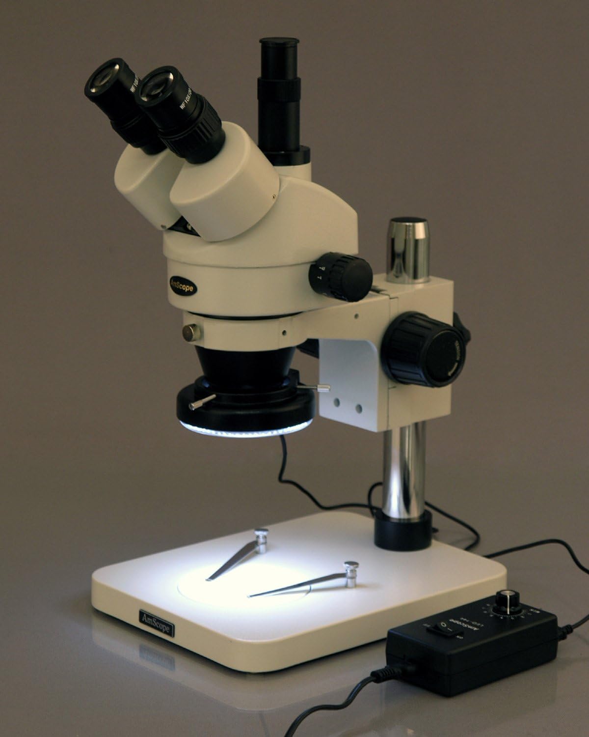 The AmScope SM-1TSY-144 professional stereo zoom microscope has a pair of 10x super-widefield high-eyepoint eyepieces, a 0.7x-4.5x zoom objective, a 2.0x Barlow lens, and a pillar stand. The microscope has an overall magnification range of 7x-90x. The trinocular viewing head has an interpupillary range of 55 to 75mm, a 45-degree inclination to reduce eye and neck strain, and 360-degree rotation to enable sharing. The vertical trinocular port can be used as a C-Mount or 23mm photo port (camera sold separately). The WH10x20mm super-widefield high-eyepoint eyepieces combine with the 0.7x-4.5x zoom objective to provide zoom magnification and a longer working distance for inspecting large-scale specimens that require handling or repair. The microscope comes with a 2.0x Barlow lens that can be added to the objective to increase the magnification range. A Barlow lens with a magnification greater than 1.0 increases the magnification and reduces the working distance. High-eyepoint eyepieces ease viewing for users who wear glasses, and dioptric adjustment accommodates individual eye-strength differences. A stereo microscope, sometimes called an inspection or dissection microscope, has low magnification and a long working distance that enables users to manipulate the object being inspected. The removable 144-bulb LED ring light provides bright, cool light for working with temperature-sensitive or live specimens. The ring light provides shadow-free illumination, and a rheostat controls the amount of light emanating from the lamp. Power and adjustment controls are located on a separate control box to speed adjustments. The light provides intensity and direction control. The ring has a 2.4" (61mm) inside diameter and a 4" (100mm) outside diameter. The light has a 100,000-hour life span, and a 110V-240V variable power supply. The table stand has a reversible black and white stage plate that provides contrast with light- and dark-colored specimens, and stage clips to secure the specimen in place. The stage plate has a 3-3/4" diameter (95mm). The stand is 10 x 7-7/8 x 10-3/4 inches/254 x 200 x 275mm (H x W x D, where H is height, the vertical distance from the lowest to highest point; W is width, the horizontal distance from left to right; D is depth, the horizontal distance from front to back).SpecificationsHeadTrinocularMagnification range7x-90xZoom objective power0.7x-4.5xEyepieces (DIN, 30mm)WH10x20mm high-eyepointTrinocular portC-Mount or 23mmField of view range1-1/4"Optical working distanceUp to 4"Microscope standPillarHead movementX-axisIllumination typeEpiscopic (reflected)Light source144-bulb LED ring light with rheostatPower100V-240VMicroscopes are instruments used to enhance the resolution of an object or image. Types include compound, stereo, or digital. Compound microscopes use a compound optical system with an objective lens and an eyepiece. Stereo microscopes show object depth in a three-dimensional image. Digital microscopes are used to display an image on a monitor, rather than looking through a lens. Microscopes can have monocular (one), binocular (two), or trinocular (three) eyepieces, with varying magnification abilities. Magnification ability refers to the size of an image. Resolution, also known as resolvant power, refers to the clarity of the image. The interaction between field of view (FOV), numerical aperture (NA), and working distance (WD) determines resolution. Microscopes can control magnification through a fixed focus, or through a range of adjustments. They can also utilize LED, fluorescent, and mirror light sources to help control viewing capabilities. Microscopes are widely used in education, lab research, biology, metallurgy, engineering, chemistry, manufacturing, and in the medical, forensic science, and veterinary industries.United Scope manufactures microscopy equipment and accessories under the brand name AmScope. The company, founded in 1996, is headquartered in Irvine, CA.What's in the Box?AmScope SM-1TSY-144 stereo zoom microscope with pillar standWH10x20mm eyepieces, 30mm, one pair0.7x-4.5x zoom objective2.0x Barlow lens144-bulb LED ring light with power supply (LED-144)Eye guards, one pairStage clips, one pairDust cover