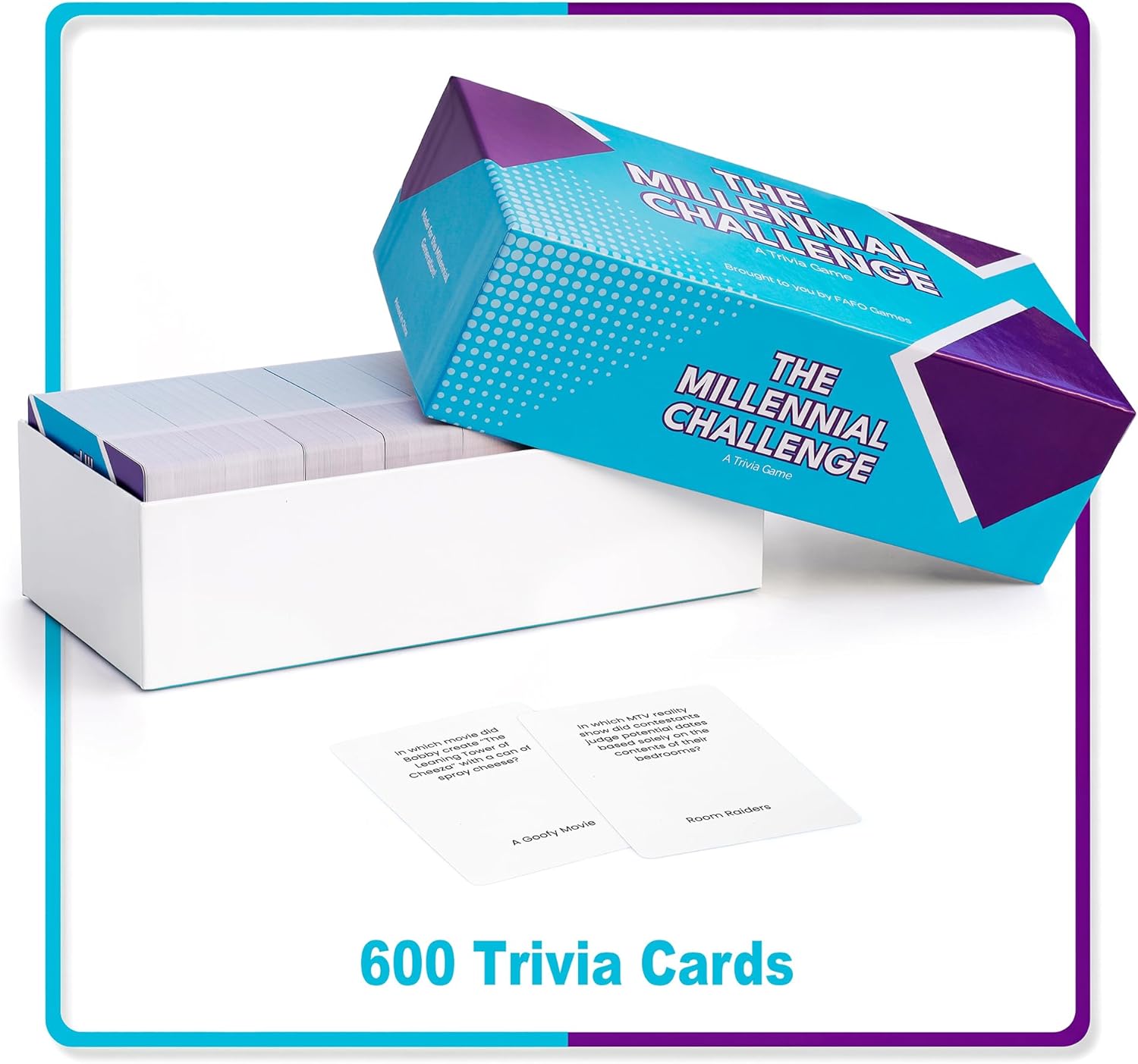 Take a trip back to the unforgettable 90s and 2000s with our fun and engaging Millennial trivia game. Designed for anyone who grew up in this iconic era, The Millennial Challenge is packed with 600 pop culture trivia cards covering everything from movies and music to TV shows, toys, snacks, fashion, video games, and early internet life. It’s the perfect way to relive the memories of AIM away messages, Blockbuster Friday nights, boy bands, and the dial-up era. This party card game is designed to bring people together, making it perfect for birthdays, holidays, or game nights with friends and family. The questions are easy to understand and fun to answer, making this nostalgic trivia game enjoyable for anyone—whether they lived through the 90s and 2000s or simply love the pop culture of that time. It’s especially ideal for adults in their 30s and 40s, who will instantly recognize the references to their favorite childhood shows, snacks, and trends. Quality matters, and this Millennial trivia game delivers. All 600 cards are printed on durable, high-quality material built to last through countless game nights. Everything comes neatly packed in a sturdy, beautifully designed box with bold 90s/2000s-inspired colors, making it both a collectible keepsake and a standout addition to your game shelf. Whether you’re hosting a big gathering or a cozy night in, this nostalgic game sparks conversation, laughter, and plenty of “OMG, I remember that!” reactions. Bring The Millennial Challenge to your next party or give it as a thoughtful nostalgia-filled gift. It’s a great choice for Christmas, birthdays, Mother’s Day, Father’s Day, Secret Santa, or white elephant exchanges. No matter the occasion, our Millennial trivia card game is sure to create fun, memorable moments as players test their knowledge and relive the best parts of growing up in the 90s and 2000s.